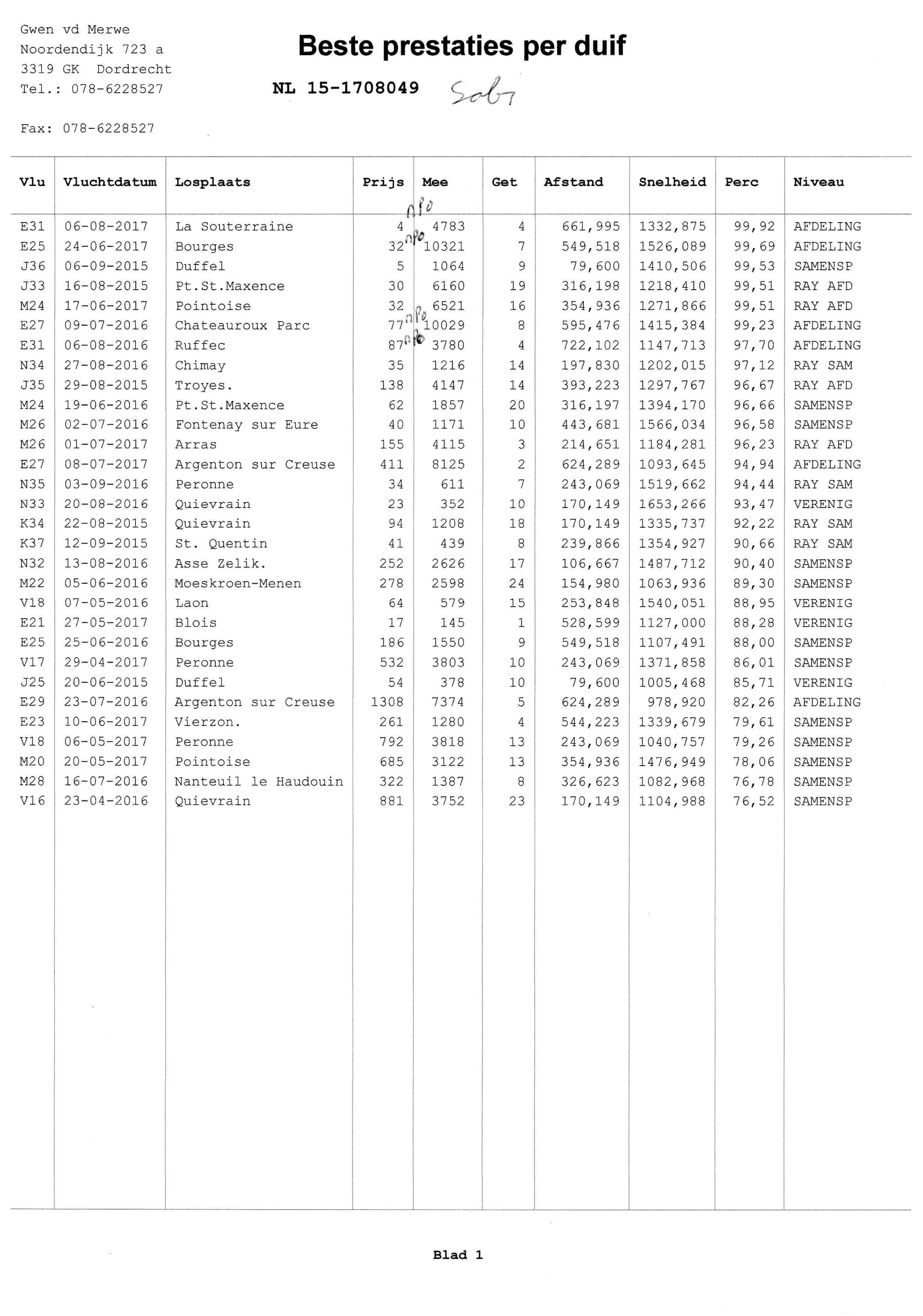 WON:  4th NPO LA SOUTERRAINE 4,783b. - 5th DUFFEL 1,064b. - 30th PONT 6,160b. - 32nd NPO BOURGES 10,321b. - 32nd PONTOISE 6,521b. - 34th PERONNE 611b. - 35th CHIMAY 1,216b. - 77th NPO CHATEAUROUX 10,029b. - 87th NPO RUFFEC 3,780b. – IS MOTHER OF 1st QUIEVRAIN (fastest of 24,000b.)