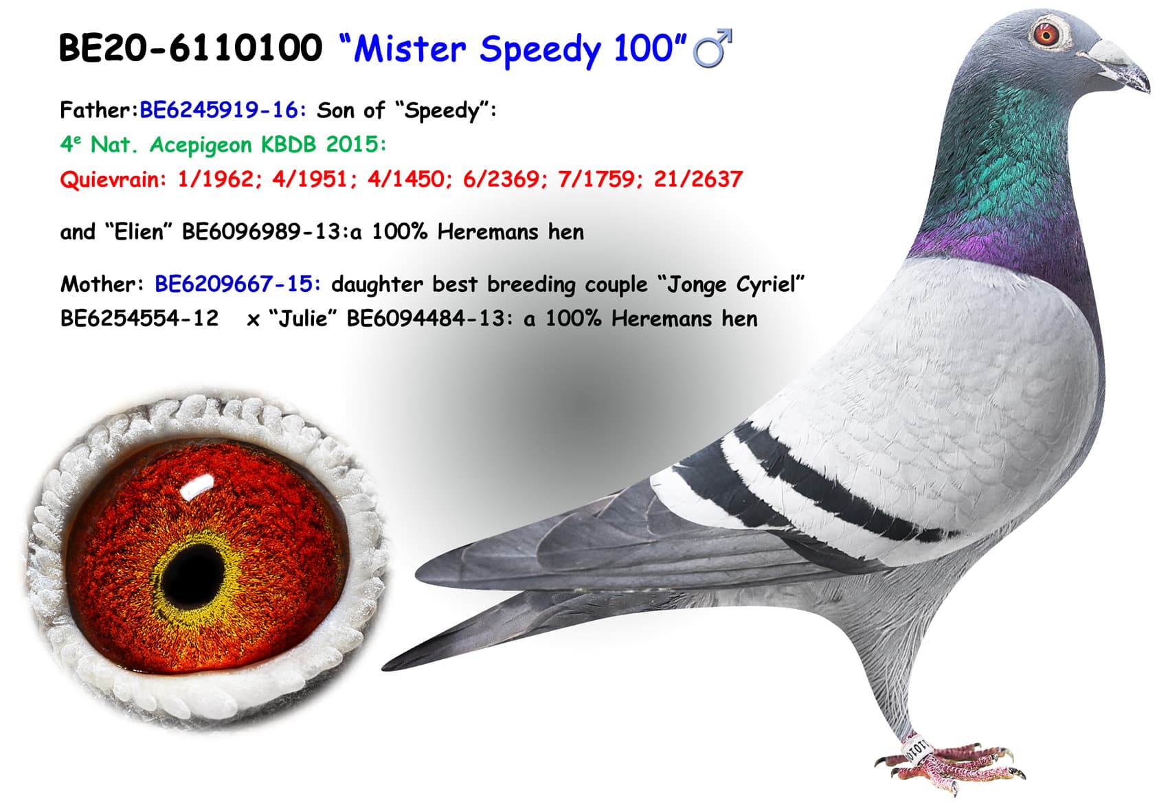 Father:BE6245919-16: Son of “Speedy”BE6208006-15: 4e Nat. Acepigeon KBDB 2015: Quievrain: 1/1962; 4/1951; 4/1450; 6/2369; 7/1759; 21/2637