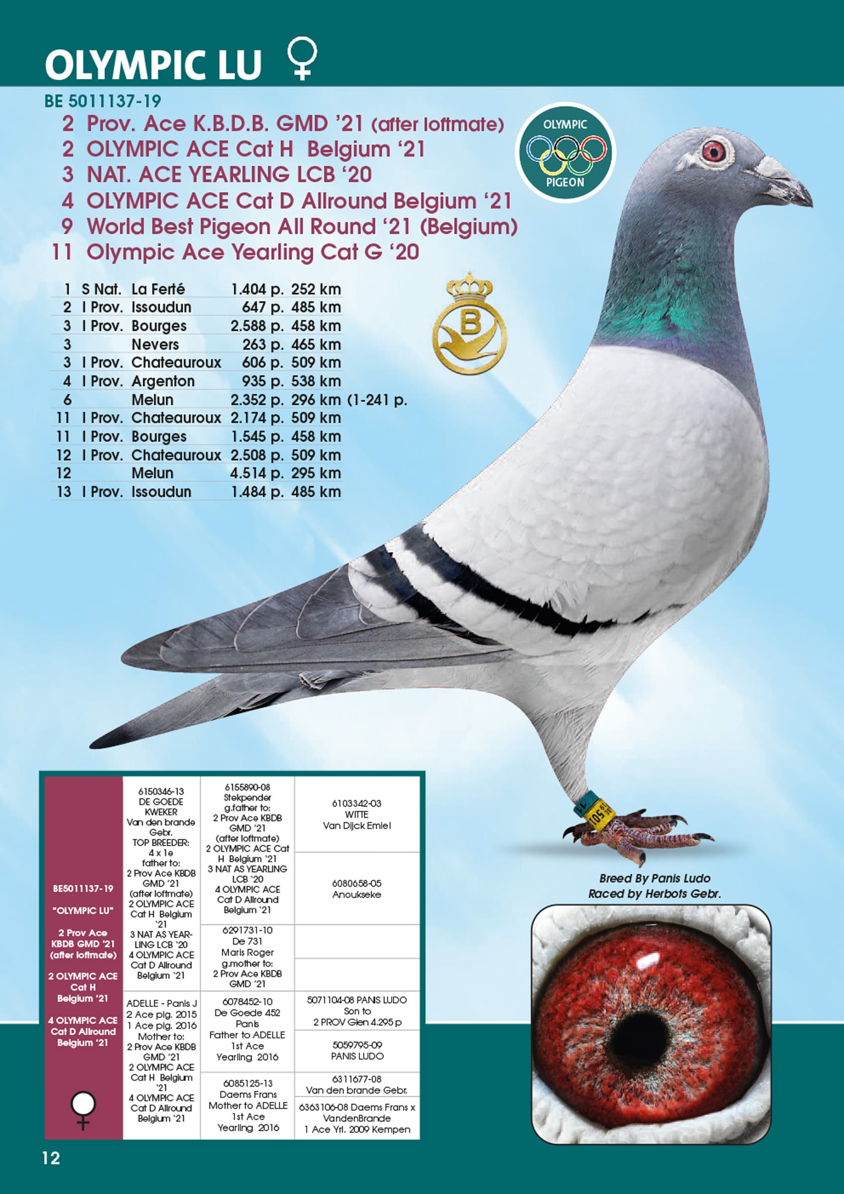 2nd Olympic Ace Cat. H. ’21 - 2nd Prov. Ace KBDB GMD ’21 - 3rd Nat. Ace YL LCB ’20 - 4th Olympic Ace Cat. D ’21 - 9th World Best Pigeon AR - 11th Olympic Ace YL ‘20