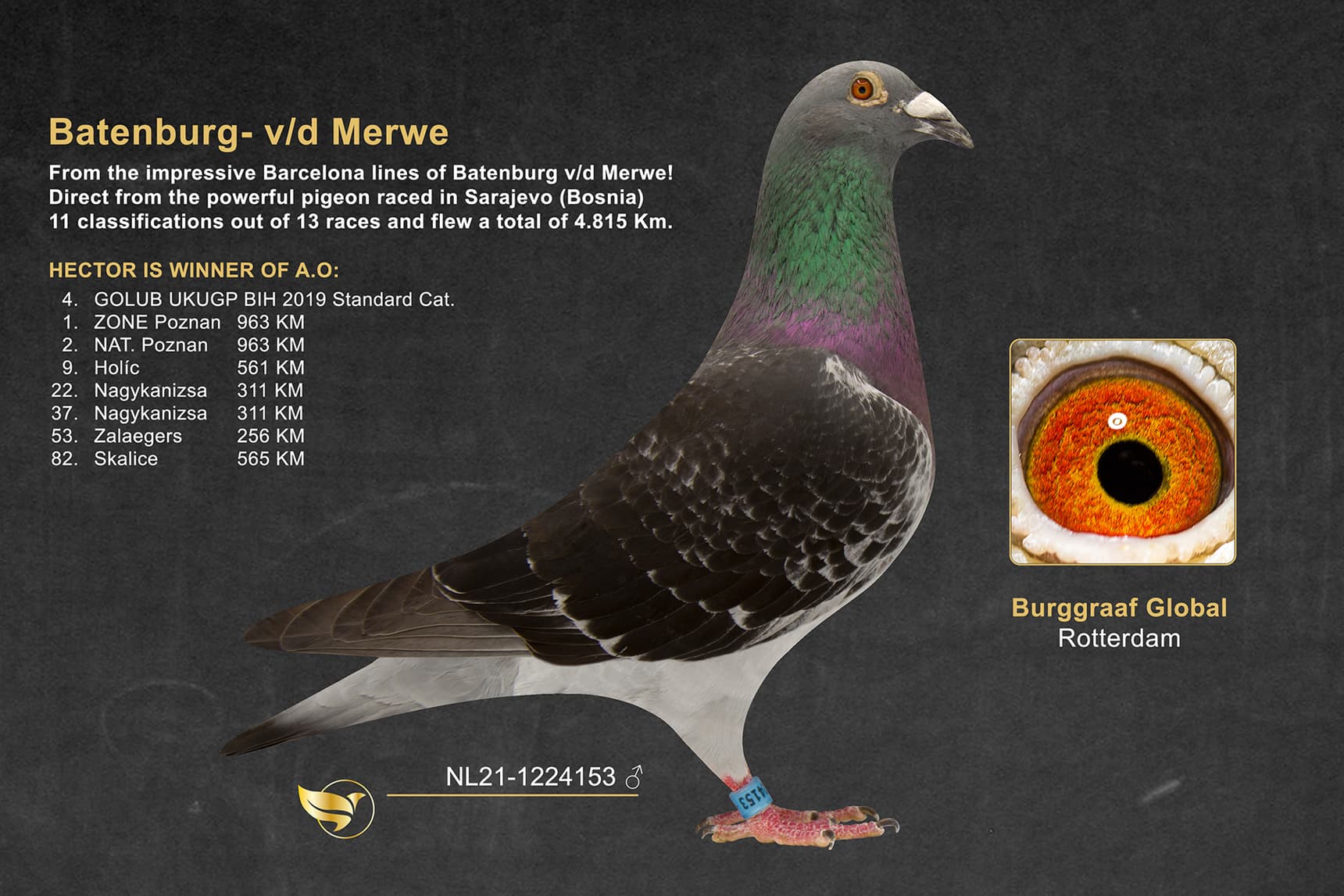 An exceptional bird, who won 2nd NAT. POZNAN 963 KM. Hector is a powerful pigeon raced in Sarajevo (Bosnia). Total 11 classifications out of 13 races and flew a total of 4.815 KM. After these performances he was purchased by Burggraaf Global to strengthen their breeding loft.