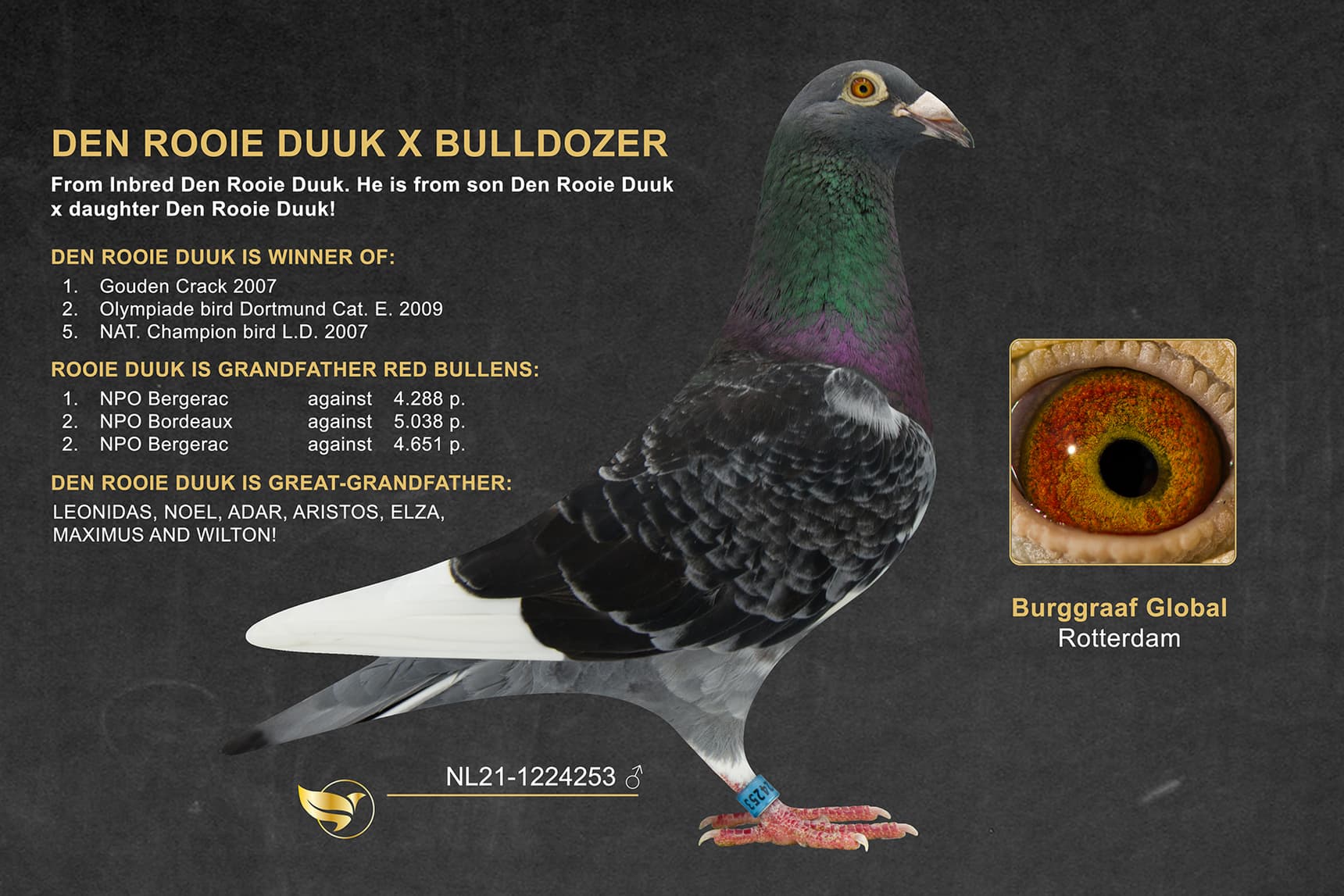 Specially from the breeding loft of Burggraaf Global. This pigeon has not been raced!