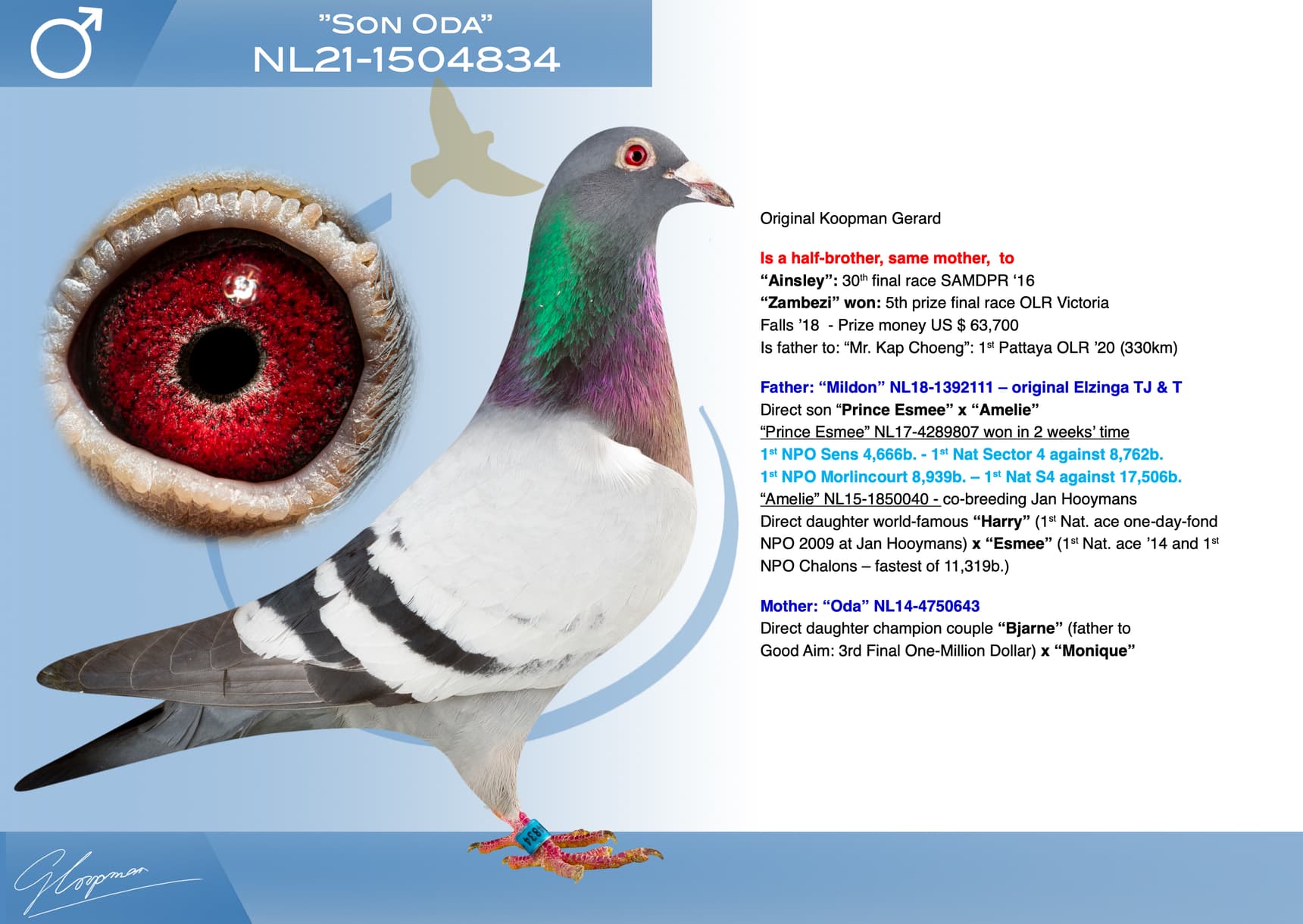 Direct daughter world-famous “Harry” (1st Nat. ace one-day-fond NPO 2009 at Jan Hooymans) x “Esmee” (1st Nat. ace ’14 and 1st NPO Chalons – fastest of 11,319b.)