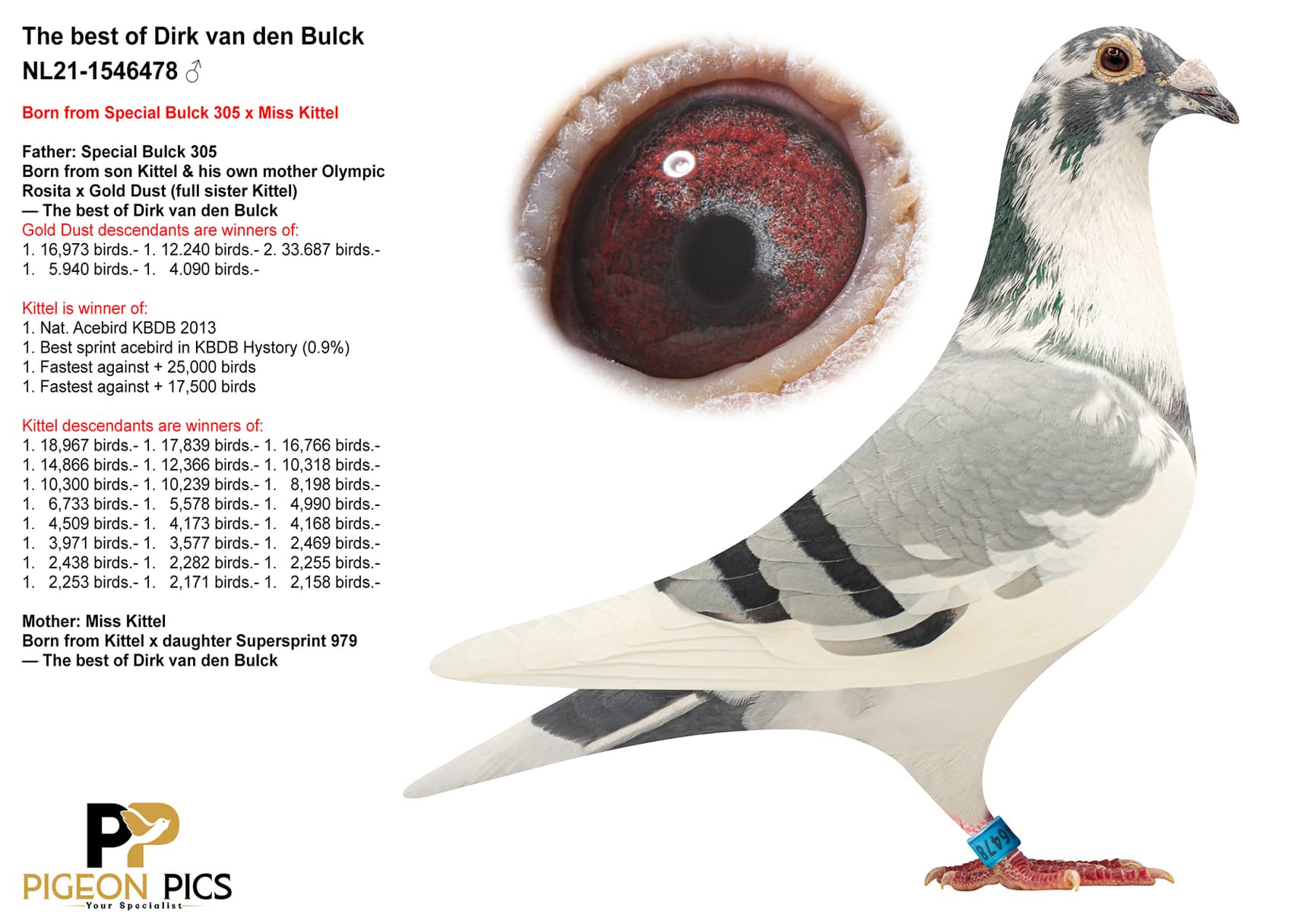 The pigeon family of Dirk Van den Bulck gained international recognition in 2012, the year when his top class hen Olympic Rosita BE12-6254038 took the title of first Olympiad Pigeon Cat. F in Nitra 2013. Olympic Rosita continued to impress by breeding two world class brothers: Kittel, BE13-6139803 and Greipel BE13-6139849, which finished in 1st and 6th place respectively in the national ace pigeon championship KBDB sprint 2013. Greipel, Super Sprint 873 BE13-6139873, and a full brother of the grandmother of Greipel and Kittel have also managed to win the title of first national champion sprint KBDB 2013. This is quite a palmares for this bloodline.