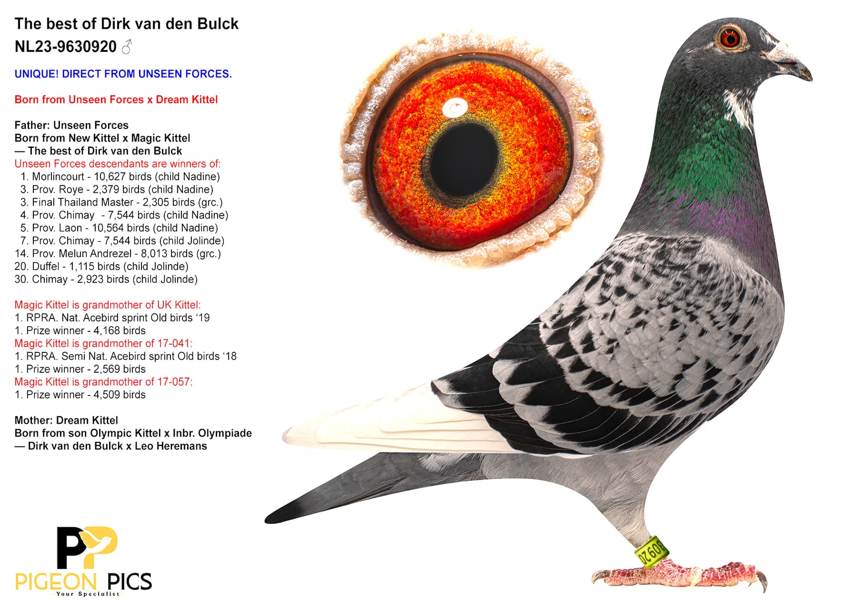 (Incl. Video) DIRECT SON SUPER BREEDER UNSEEN FORCES! 4 Times super pair Goede Rode x Olympic Rosita of Dirk van den Bulck in pedigree! They are parents of: Kittel, New Kittel, Greipel, Magic Kittel and so on.