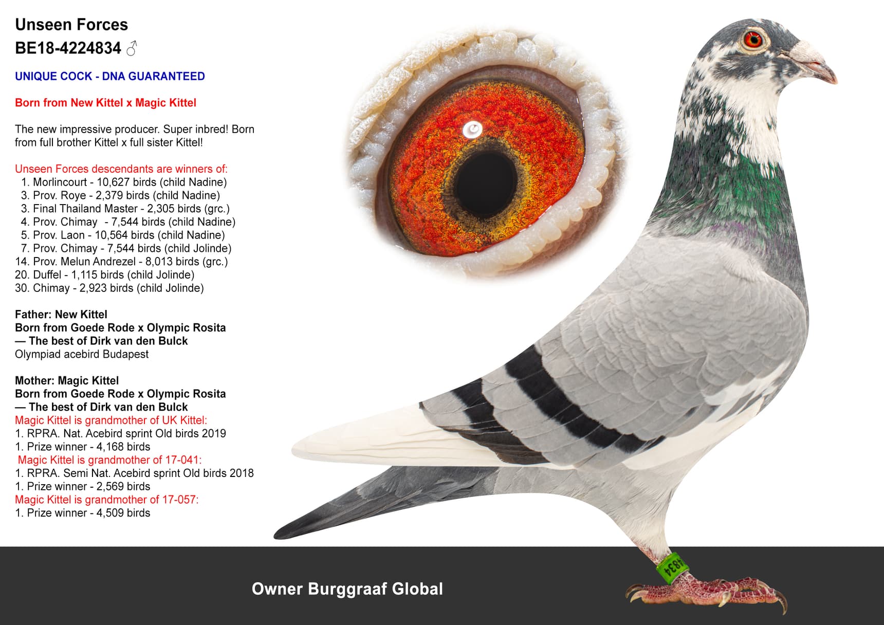 Unseen Forces is the new impressive producer of the Burggraaf Global breedingloft. He is a very strong inbred product to Goede Rode x Olympic Rosita. They are parents of: Kittel, New Kittel, Greipel, Magic Kittel and so on. Unseen is original Flanders Collection, Liedekerke.