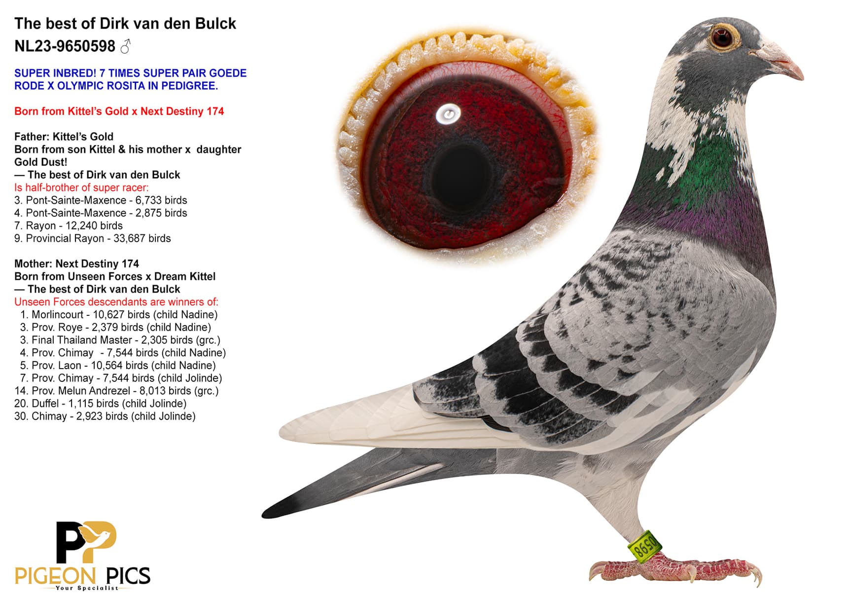 The pigeon family of Dirk Van den Bulck gained international recognition in 2012, the year when his top class hen Olympic Rosita BE12-6254038 took the title of first Olympiad Pigeon Cat. F in Nitra 2013. Olympic Rosita continued to impress by breeding two world class brothers: Kittel, BE13-6139803 and Greipel BE13-6139849, which finished in 1st and 6th place respectively in the national ace pigeon championship KBDB sprint 2013. Greipel, Super Sprint 873 BE13-6139873, and a full brother of the grandmother of Greipel and Kittel have also managed to win the title of first national champion sprint KBDB 2013. This is quite a palmares for this bloodline.