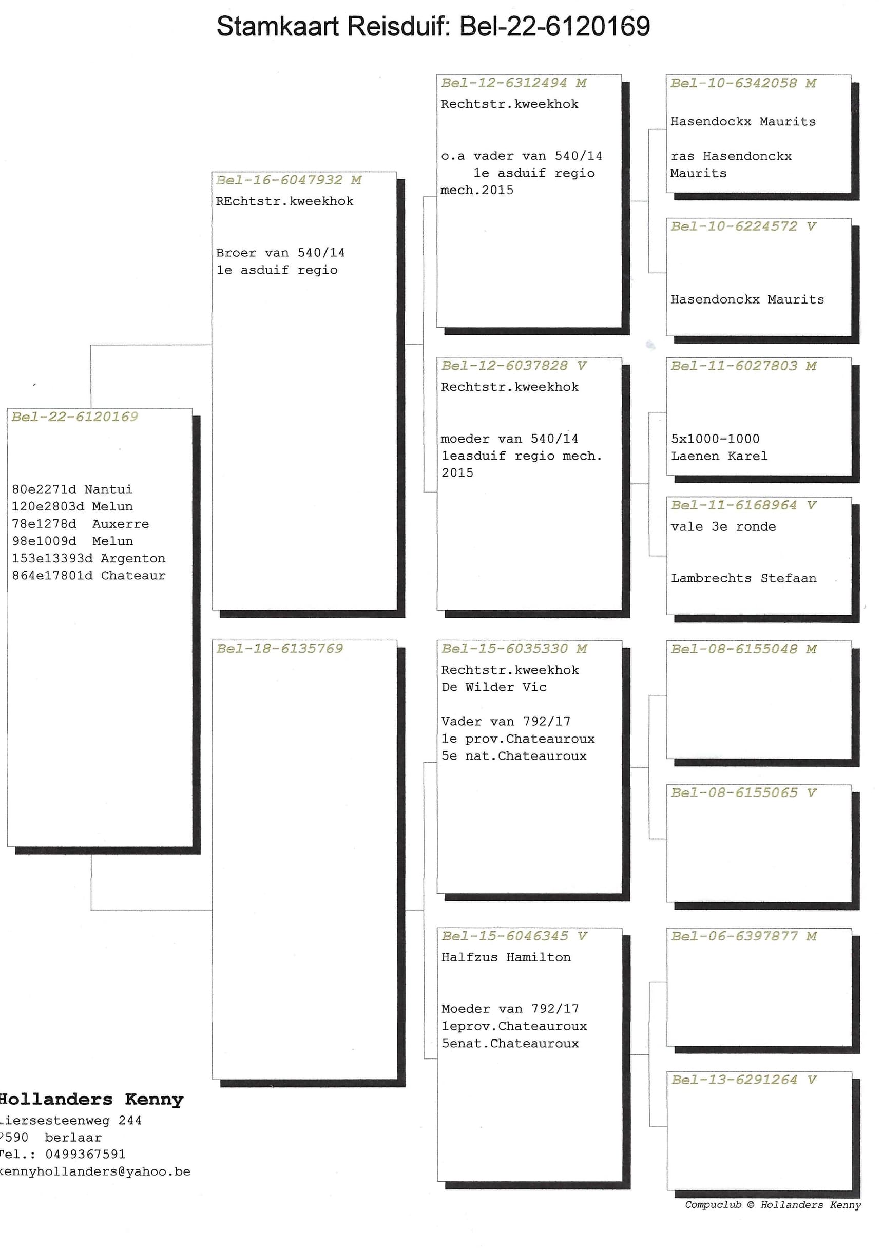 "Too bad I didn't see them arrive" Kenny begins his story "Children and grandchildren were here playing in the pool and when I went on the internet to look at the speeds of the first pigeons I saw that my name was listed at the top. When you see that, your heart skips a few beats and you run to the loft to see if that is all correct. And indeed my blue hen "B22-6120169" was sitting proudly next to her cock. With an average speed of 1281.78 m/m, she turned out to be not only the fastest in her category but also the very fastest of 26,505 Argenton pigeons. An indescribable feeling.
