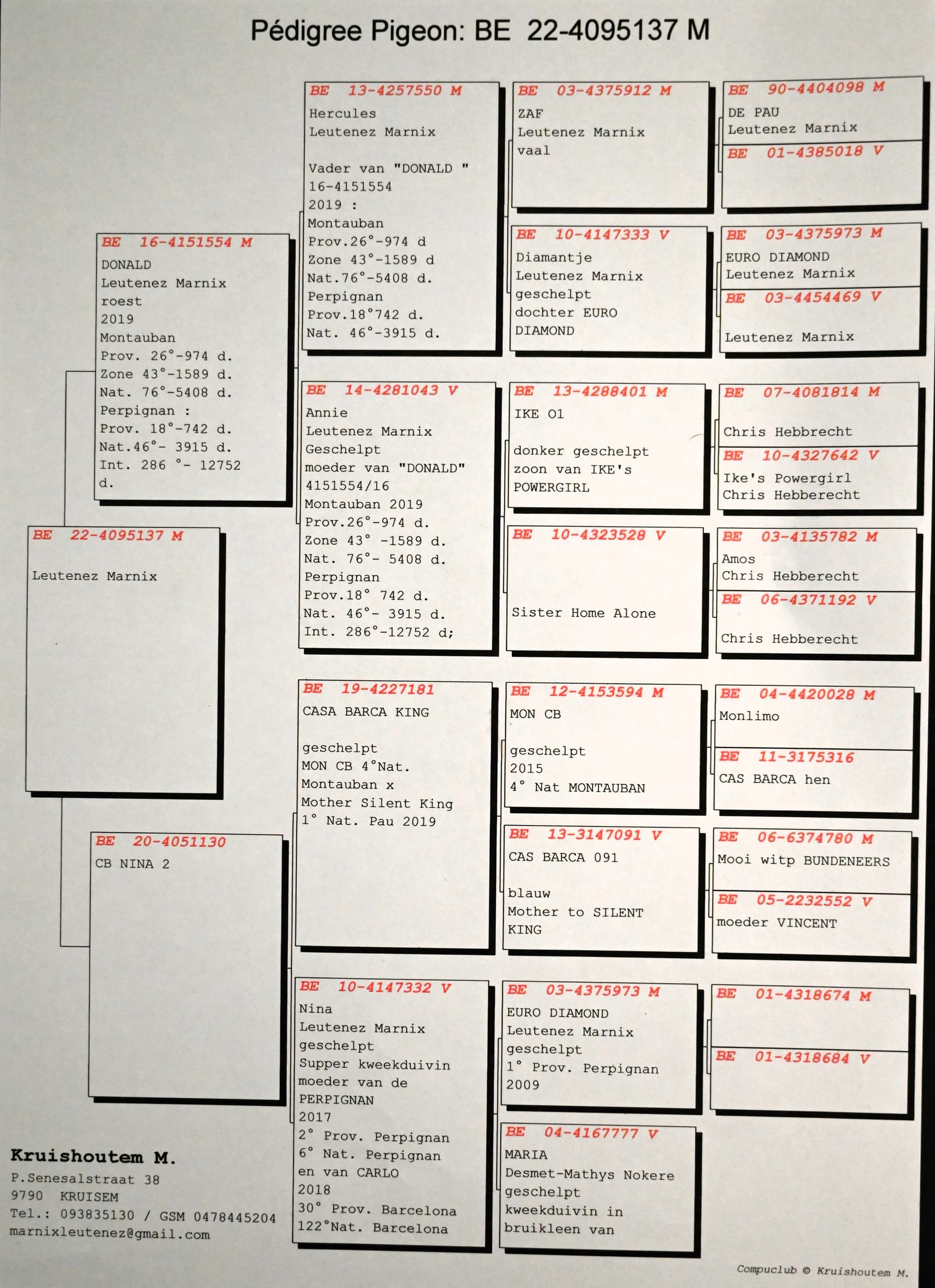 National winner Tulle and also the fastest of all 13,634 Tulle racers became the beautiful red cock "B22-4095137" of known marathon player Marnix Leutenez from Kruisem. Marnix is anything but an unknown as he has previously won several Top-10 national listings and was crowned 1st national long-distance KBDB champion in 2019.
