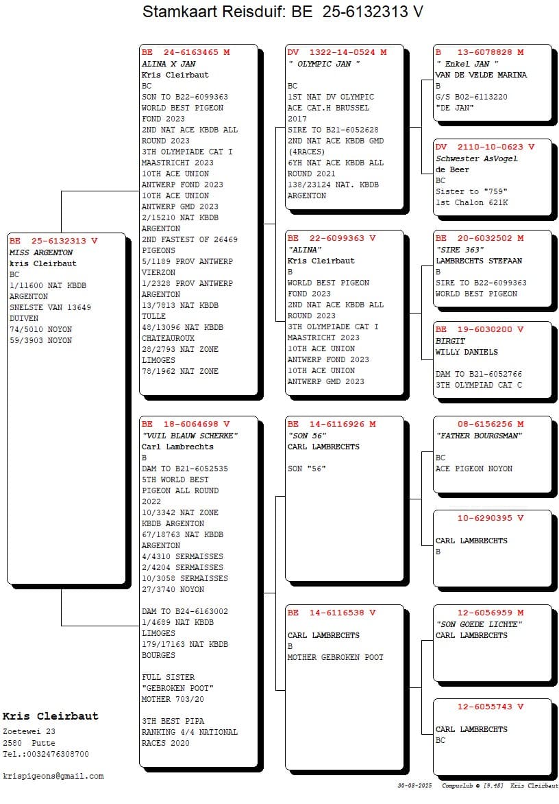 Son of “DV 524/14” Olympic Jan won himself 1 Nat Olympiad Pigeon old Germany in Brussels 2017 for the colony of S.G. Borger. He was also the grandfather of "Mr. Great Wall" 1st Nat. Limoges 4,689 p. 2025 x "BE 363/22." Alina won 2nd Nat. Ace Pigeon All-Round old KBDB 2023, 3rd Olympiad Pigeon Long Distance Maastricht 2024, and 1st World Best Pigeon Long Distance 2024. She won, among others, 2nd Nat. Argenton 15,210p., 13th Nat. Tulle 7,813p., 48th Nat. Chateauroux 13,096p, 100th Nat. Argenton 13,393p, and 1st Prov. Argenton 2,328p.