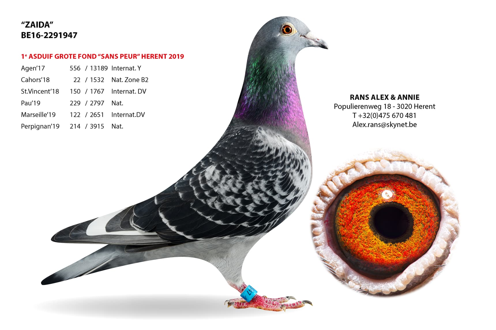 Dans la souche du 1er Internat.Barcelona'19 des cousins Rans Stijn & Jeroen se trouve également le sang du "317" - dans la 5ème génération. Mais aussi la preuve que le sang de fer continue à donner leurs super gènes encore et encore.