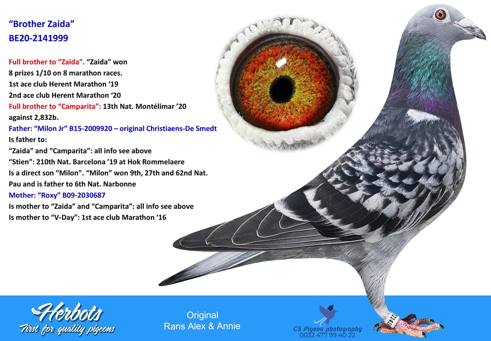 Dans la vente aux enchères en ligne qui se déroule du 14 au 24 mars, vous pouvez trouver des enfants directs de quelques pigeons voyageurs mentionnés ci-dessus comme par exemple 2 enfants directs 'Zevlakov' à savoir BE20-2026398 (N° 1) et BE20-2142052 (N° 2). Et un enfant direct de 'Chadli' à savoir BE20-2142055 (N° 4). Aussi une fille direct du top femelle 'Zaïda' (1 As International 2019-2020) et un frêre d'elle: BE20-2142052 (N° 2) and BE20-2141999 (N° 12).