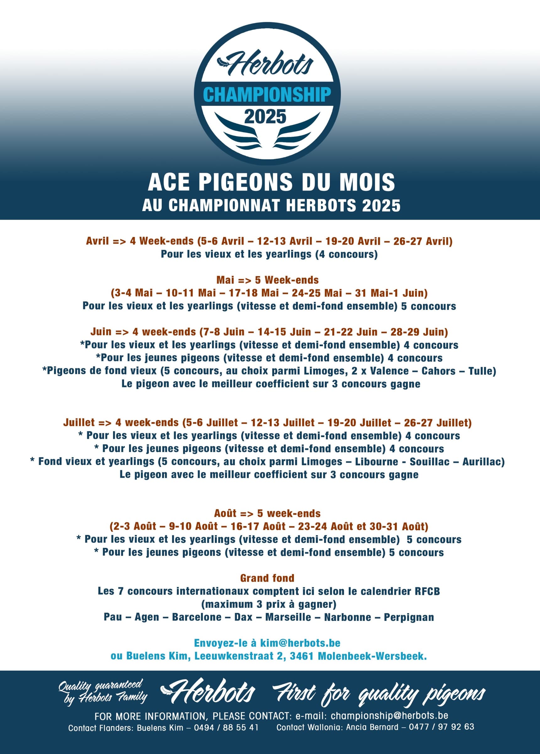 Les 3 premiers lauréats recevront un rapport de leur as pigeon sur notre site www.herbots.be.