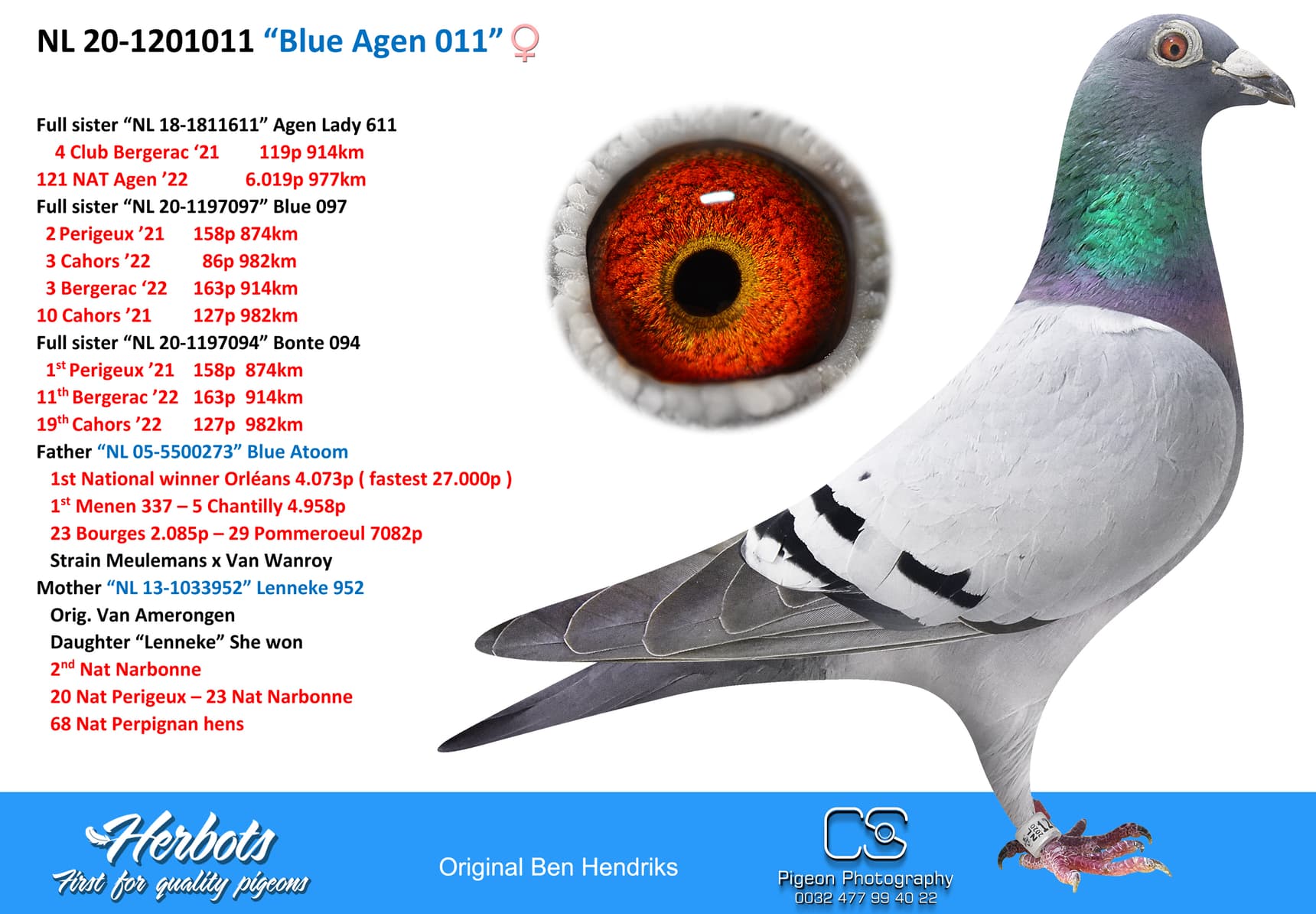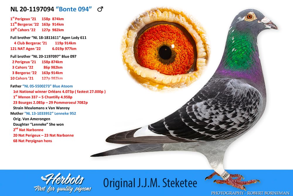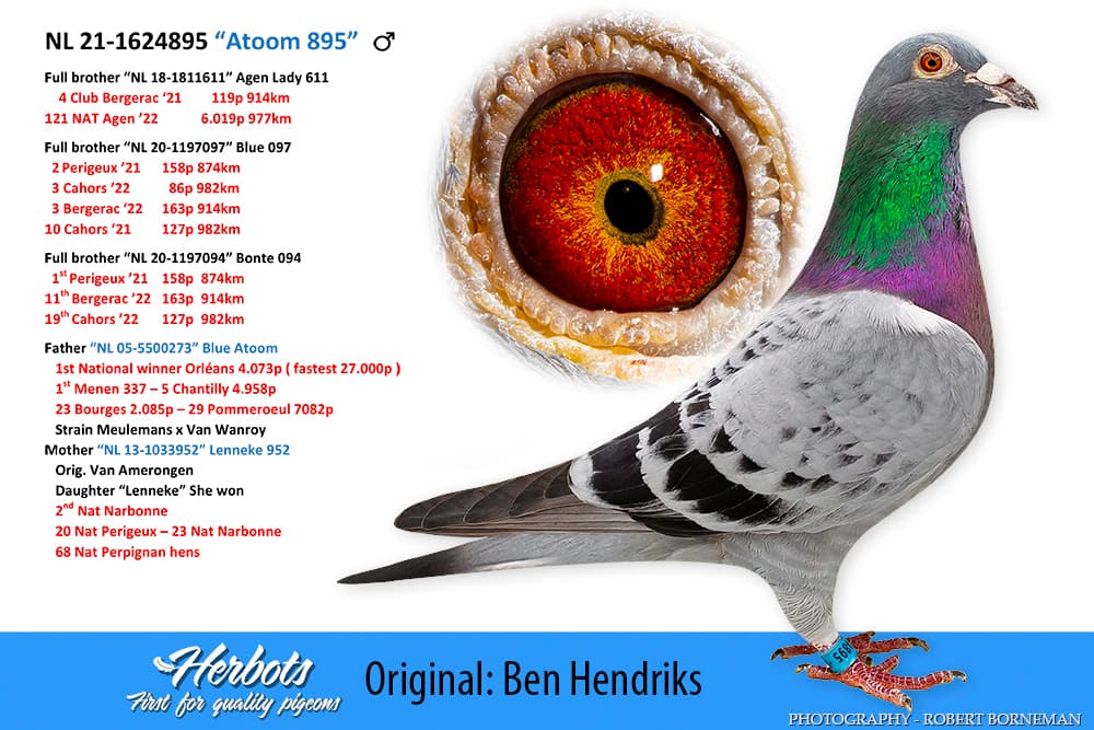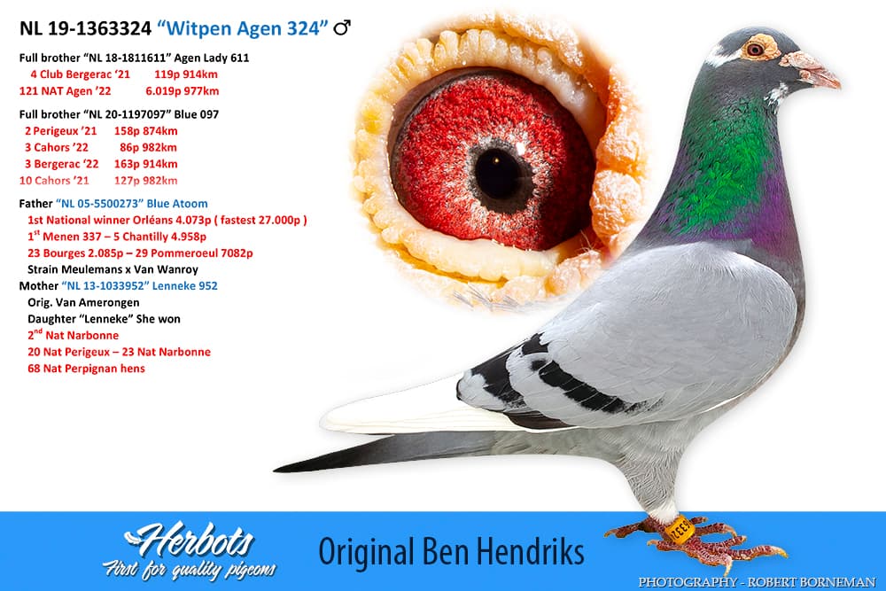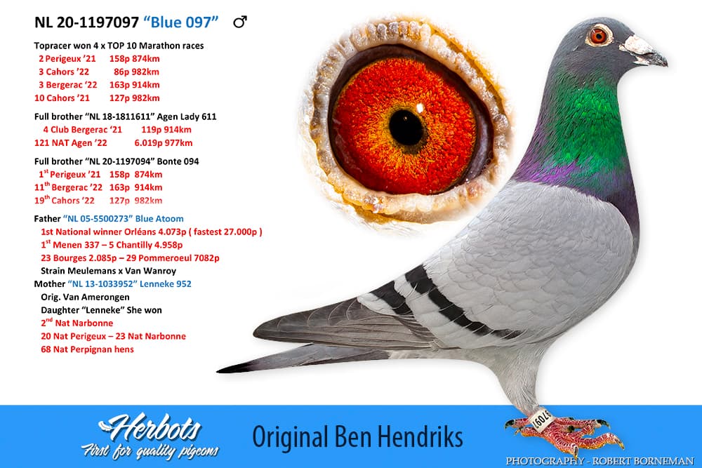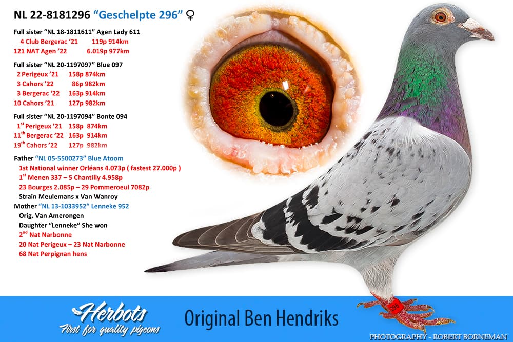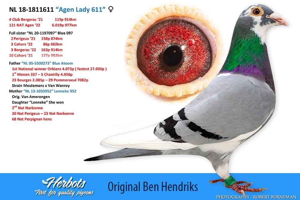 Ses différents enfants ont volé en tête lors des courses de fond extrême, de sorte que les pigeons peuvent également briller sur des vols plus courts si vous les croisez avec d'autres pigeons. Chez Ben, il était généralement associé au « Lenneke 952 » de Van Amerongen. « Lenneke 952 » est une fille de la top femelle « Lenneke » qui a remporté le 2e National Narbonne – 20 Nat Périgeux – 23 Nat Narbonne et 68 National Perpignan femelles.