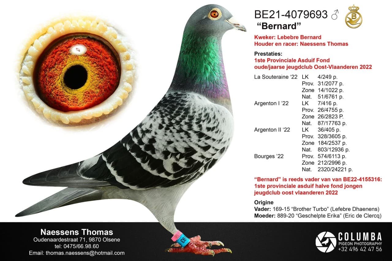 Ten Naessens house won “693/21” 51 Nat La Souterraine 6,761p and 87 Nat Argenton 17,763p. He became 1st Prov Ace pigeon youth KBDB 2022 and his child wins 1st Prov Ace pigeon youth middle distance youngsters KBDB 2022. This "693/21" was bred out of "Broer Turbo" x "Sister Erika" which you can find in lot 8.