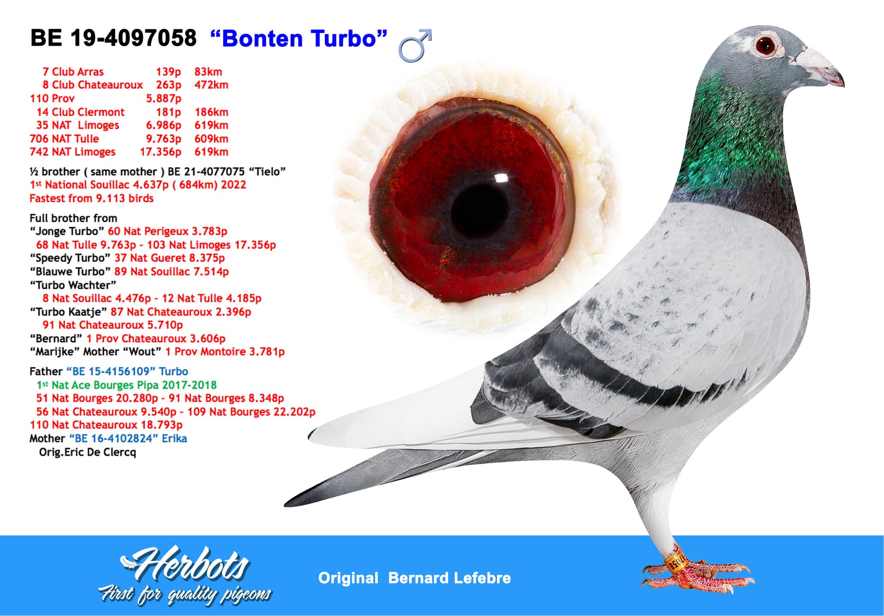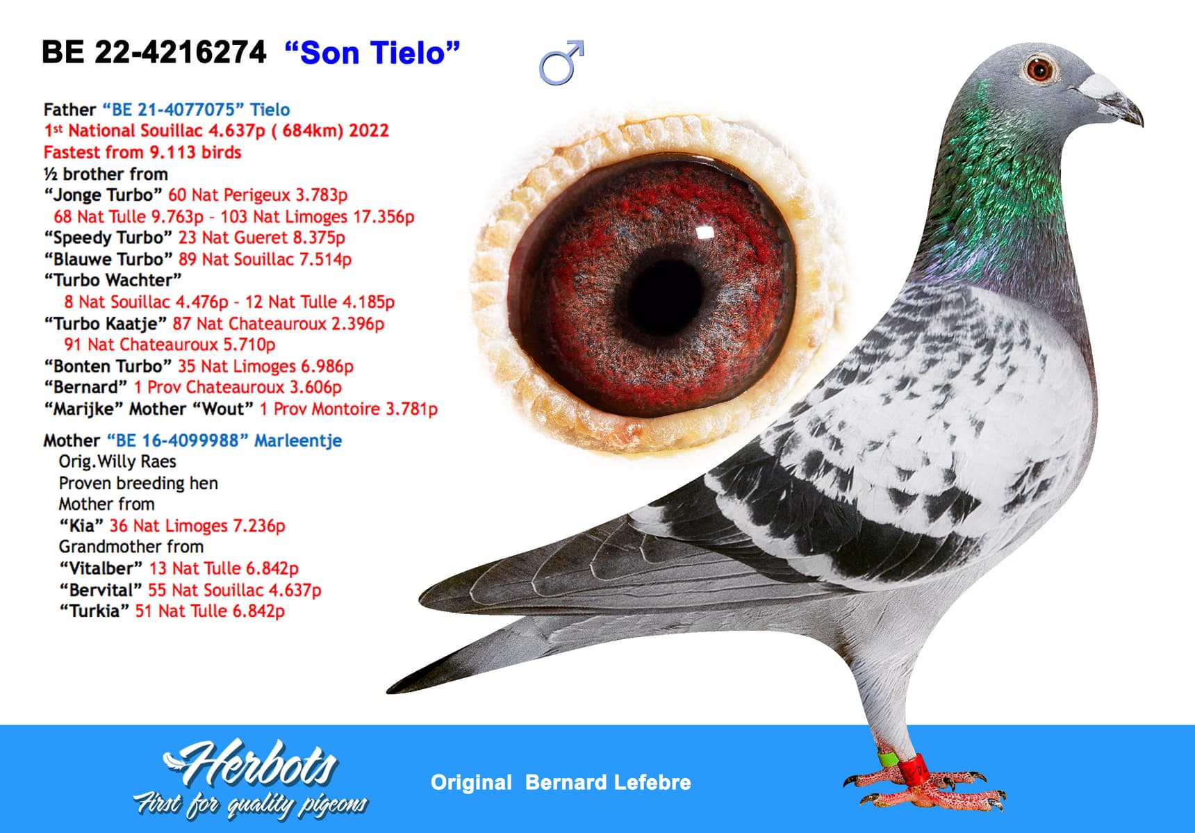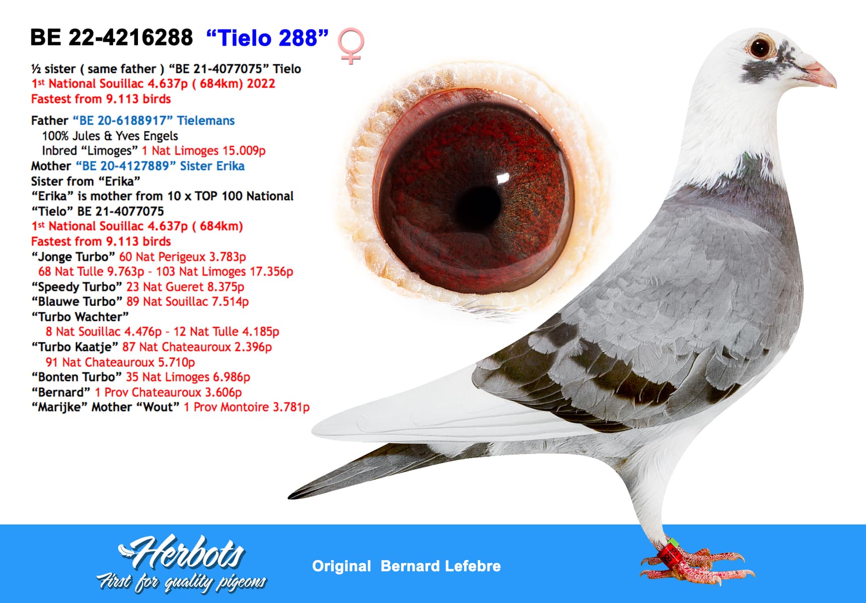 Daughter of "Tielemans" who is father of national winner "Tielo" who won 1st National Souillac 4.637 pigeons ( fastest of 9.113 pigeons ) and "Sister Erika" who is mother of "693/21" 2 x TOP 90 National in 2022