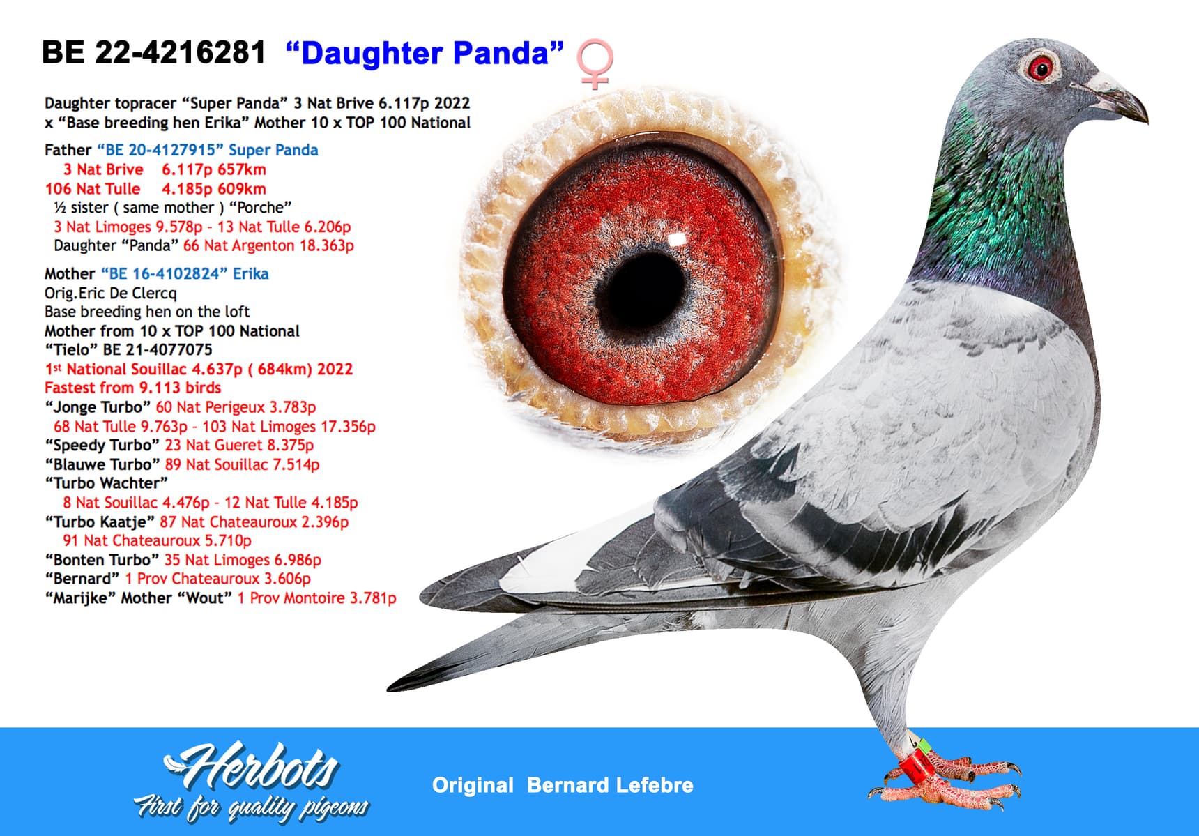 Daughter of top racer “Panda” 3rd National Brive 6,117 pigeons and stock hen “Erika” who is mother of 11 x TOP 100 National in total.