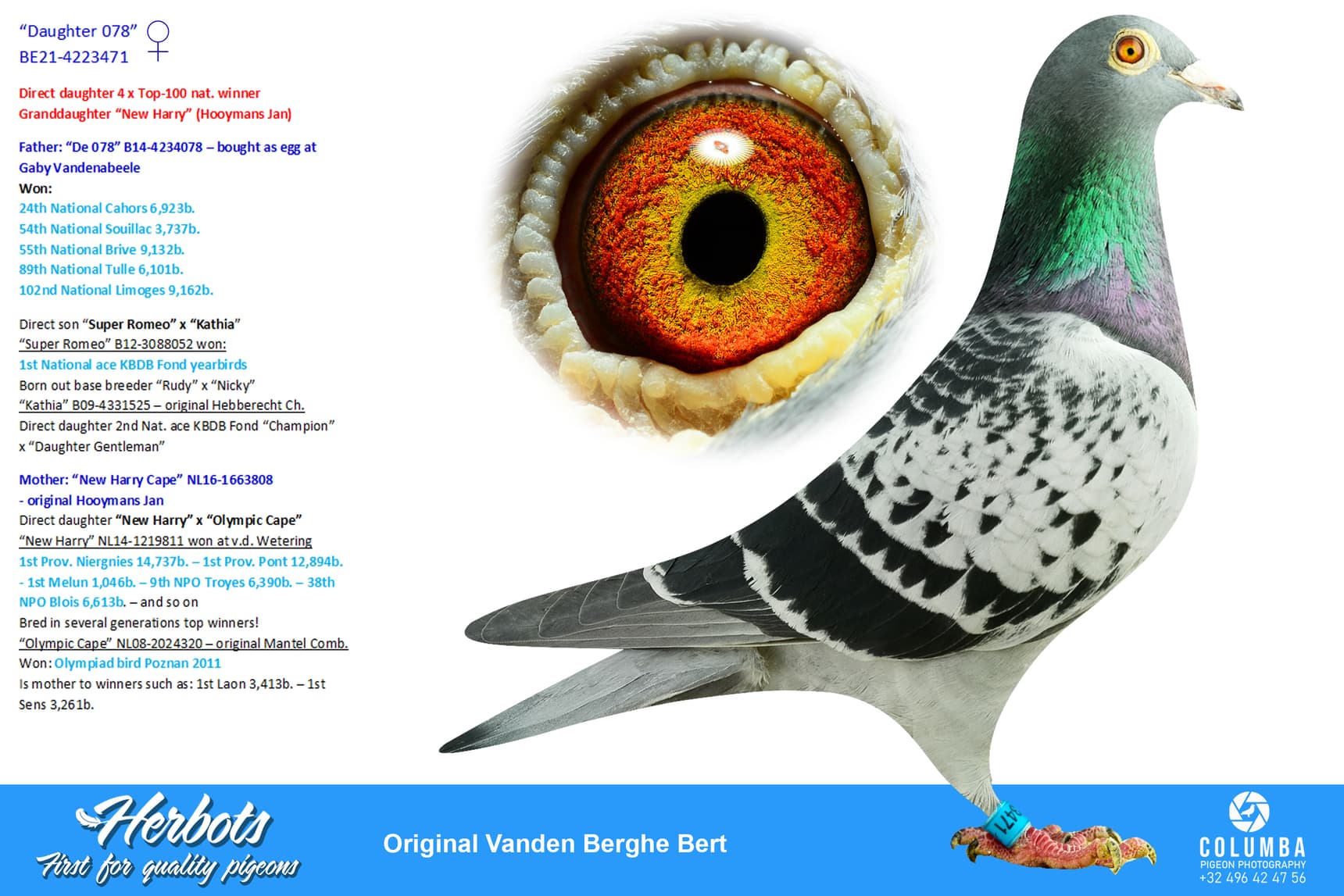 In a later phase, this foundation was supplemented with the best of Raf and Kurt Platteeuw, Jan Hooymans, Freddy & Jacques Vandenheede, Sorin, Clicque and some individual pigeons that were successfully inbred.
