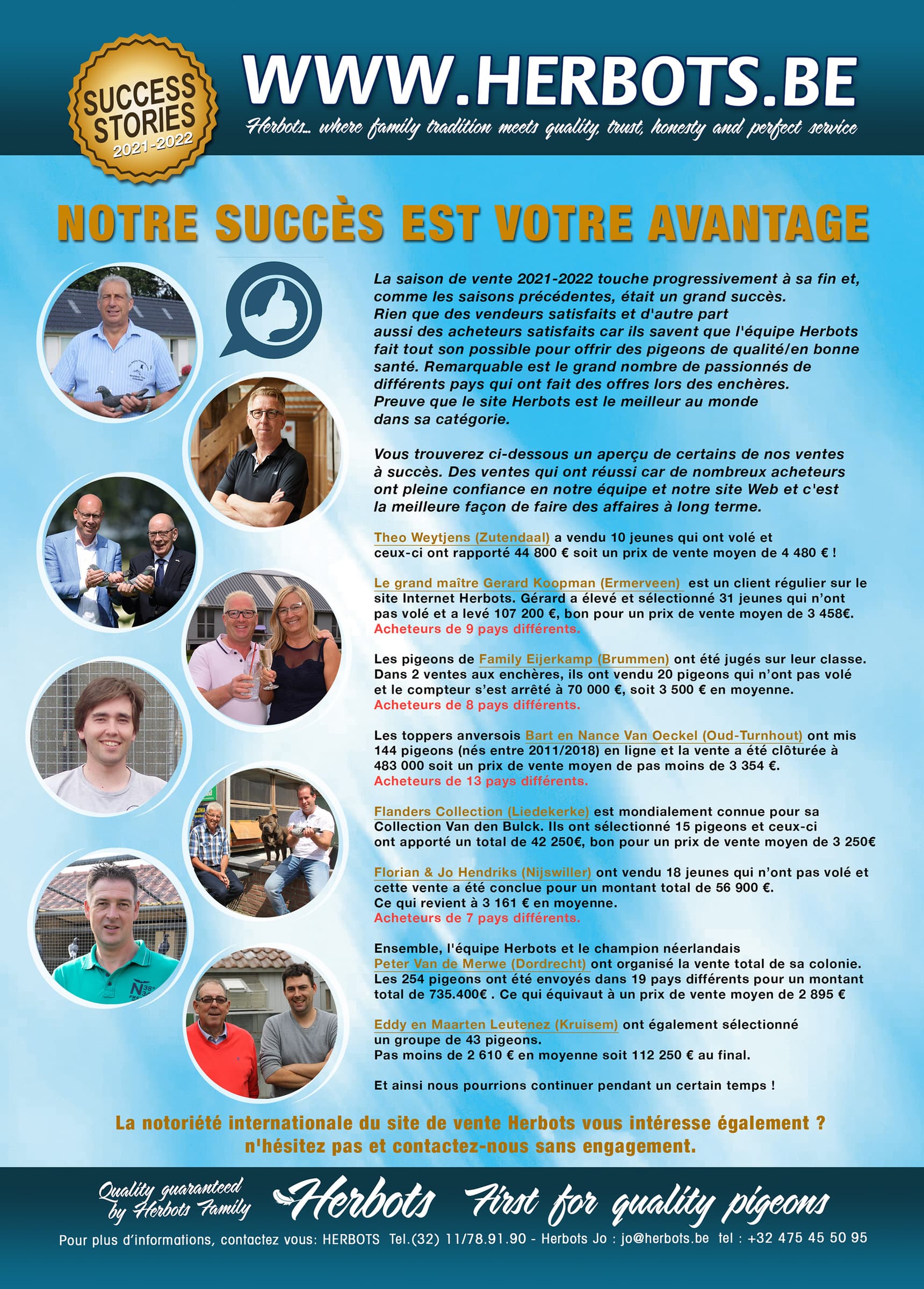 Comme toutes les éditions précédentes, la famille Herbots sera également présente avec un stand spacieux et l’équipe Herbots se fera un plaisir de vous offrir un verre. Vous pourrez y également emporter gratuitement notre catalogue de renommée mondiale « Racing to 2022 ». Si vous souhaitez des informations sur l’offre et/ou la vente des pigeons ou si vous souhaitez faire votre choix parmi la gamme complète de Herbots Animal Products et Herbovet…alors n’hésitez pas à visiter le stand Herbots (numéro 650). Miet, Jo, Raf et toute l’équipe Herbots sont prêts pour vous.
