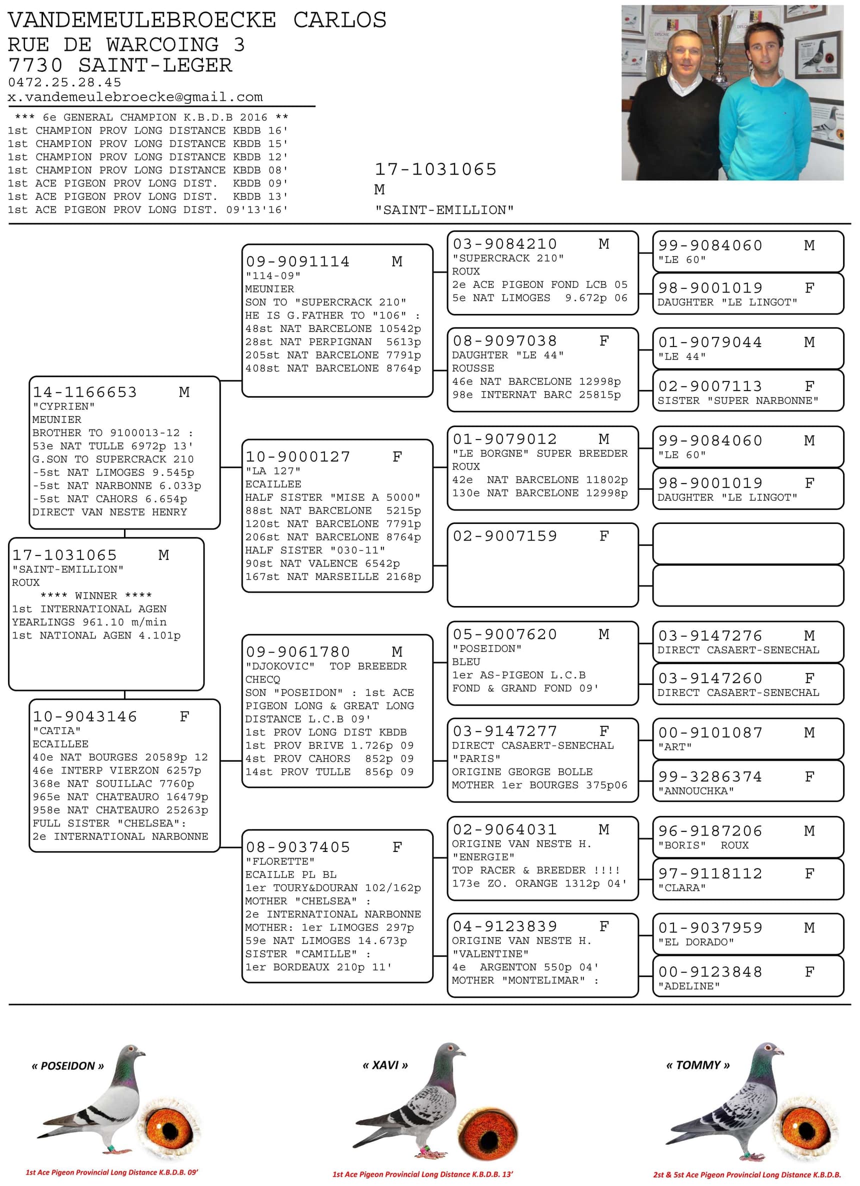 Many in pigeon racing are well aware of the danger of success. Getting to the top is already an exploit in itself, keeping up in the lead is of another difficulty. This is only possible when new top birds are born and trained every year. For this to happen, there must be a solid breeding base that is bulging with quality. At Saint Leger with Carlos and Xavier, this is undoubtedly the case. Not a season goes by without new top pigeons showing up, yearlings emerging kneaded from the solid breeding strain. The results prove this.