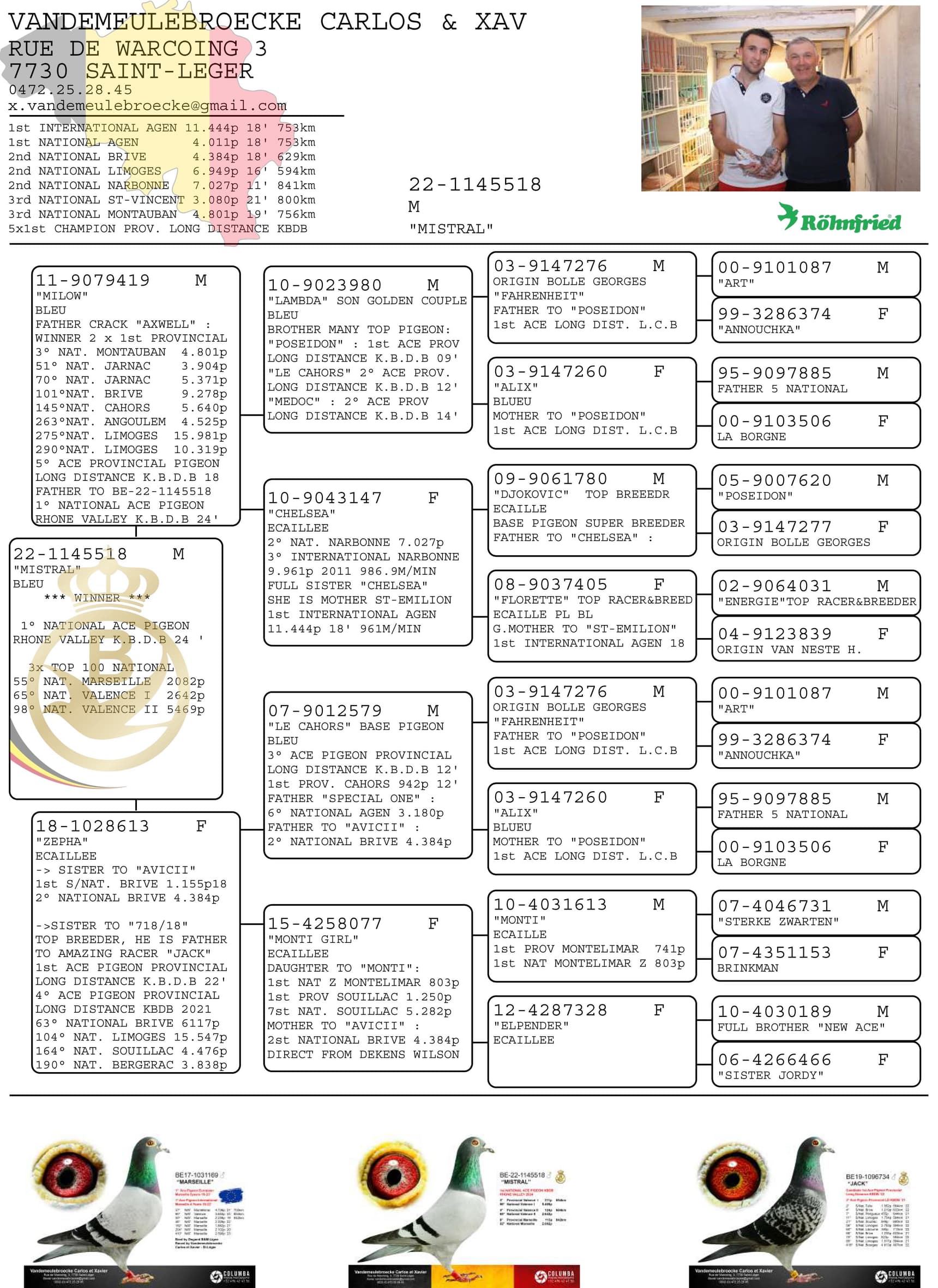 Un titre de plus est venu s’ajouter, en cette année 2024, au palmarès déjà bien fourni du sympathique Tandem Vandemeulebroecke (Père/Fils) de Saint-Léger dans le Hainaut, celui de 1er As-Pigeon ‘ Route du Rhone ’ RFCB 2024 (3 concours), gagné par ‘ Mistral ‘ BE22-1145518, un mâle bleu, plein de caractère. En effet, ‘ Mistral ‘ en début de saison, était dans un pigeonnier contenant 9 pigeons, 2 furent perdus rapidement, il en restait donc 7, et Mistral était devenu le mâle dominant de ce pigeonnier. Ensuite au fur et à mesure de la saison, chaque semaine, 1 mâle était retiré du pigeonnier, pour arriver avec seulement 2 mâles dans le pigeonnier, la semaine de la mise en panier pour Marseille et ‘ Mistral ‘ passait alors sa journée à se bagarrer avec l’autre mâle restant, ce qui l’a certainement bien motivé pour se classer à ce concours.