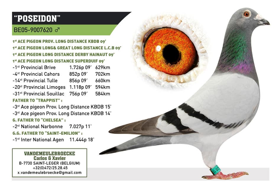 Poséidon fut 1er As-Pigeon Provincial Long Distance RFCB 2009 et 1er As-Pigeon Provincial Fond & Grand Fond L.C.B. 2009 et sa descendance est exceptionnelle puisque on retrouve des nombreux top 100 Nat. et qu’il est :