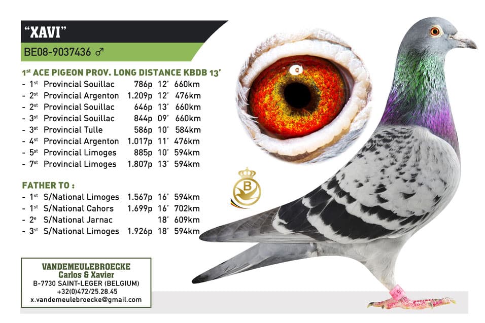 ‘ Xavi ‘ fut 1er As-Pigeon Provincial Long distance KBDB 2013 et en plus d’être un fantastique voyageur, il est aussi un excellent reproducteur puisqu’il est :