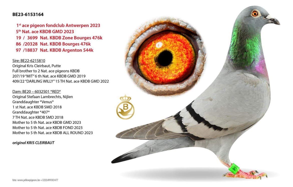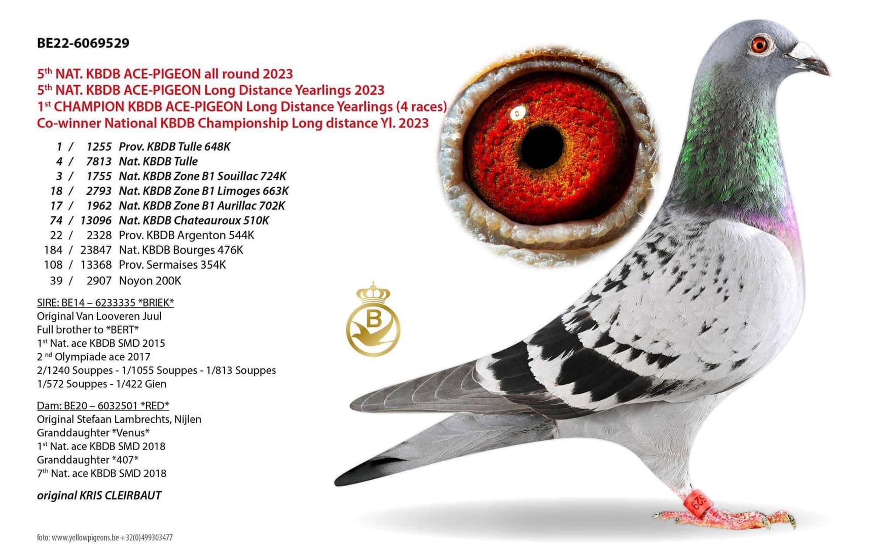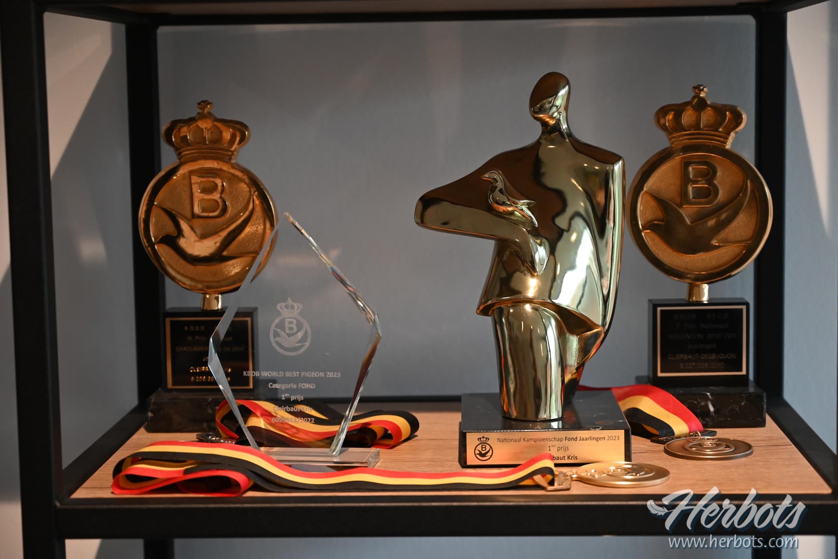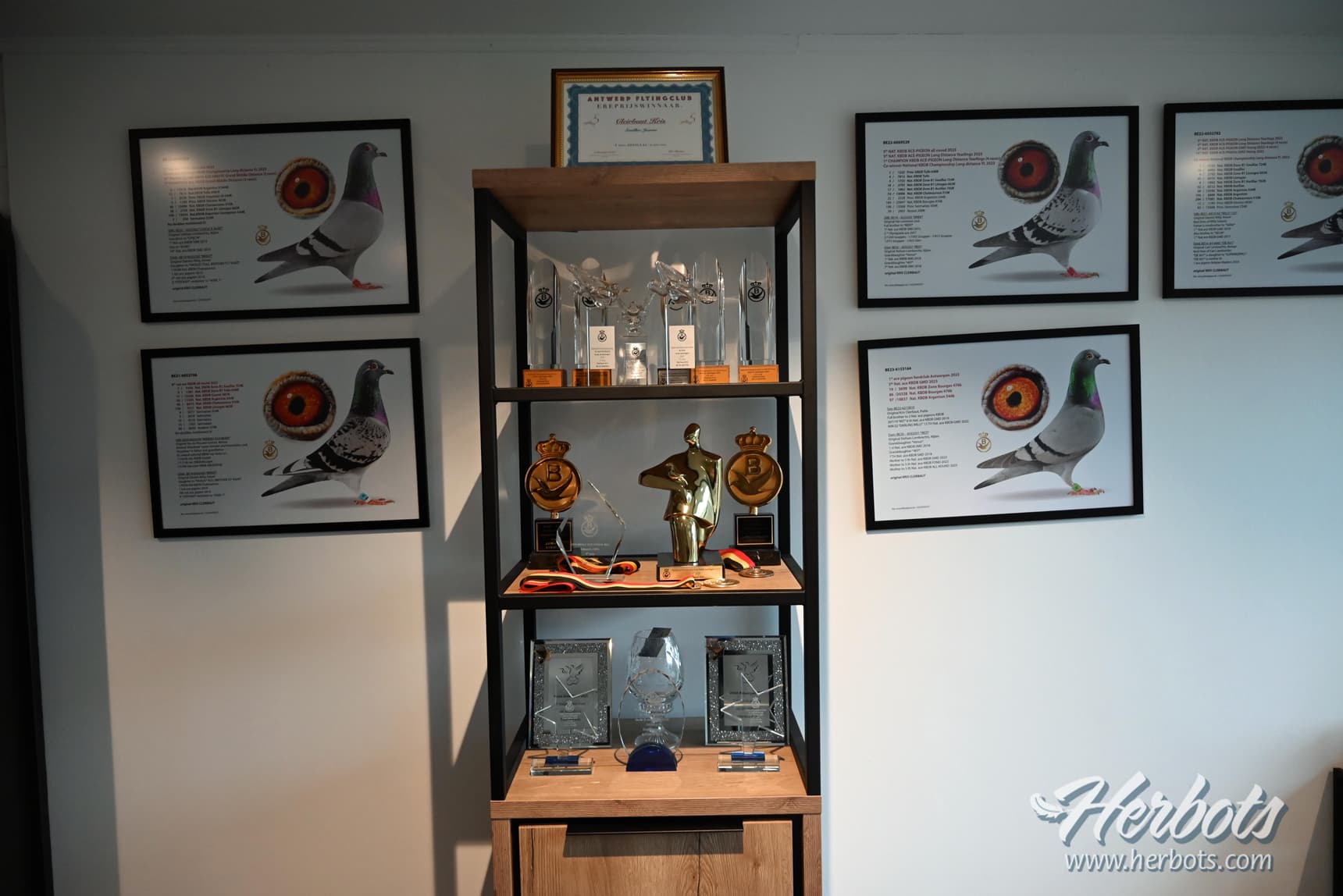 Kris poursuit : "Le succès dans la colombophilie repose sur de nombreuses facettes. Premièrement, vous devez avoir plus que de la qualité à votre actif et nous l'avons trouvé entre autres avec Willy Daniels (son type est dominant dans mon pigeonnier) soutenu par des pigeons de Stefaan Lambrechts, Carl Lambrechts, Juul van Looveren, Rudy van Reeth, Danny Van Dyck et le meilleur éleveur "Olympic Jan" (un pigeon allemand de l'Olympiade avec beaucoup de sang de Heremans).