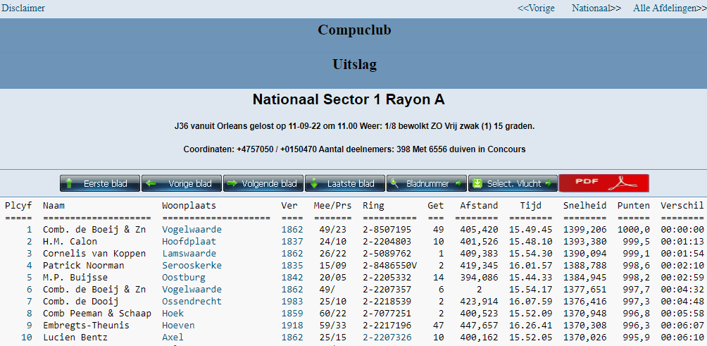 For the victory, hen "Marie Louise" was in charge. "Marie Louise" (NL22-8507195) covered the 405km at an average speed of 1,399.20 m/m. "Marie Louise" was basketed on a pair of youngsters about 10 days old. It had been four seasons since the youngsters participated in the flights in nesting position and lo and behold, now they get the 1st "big" victory for their owners.