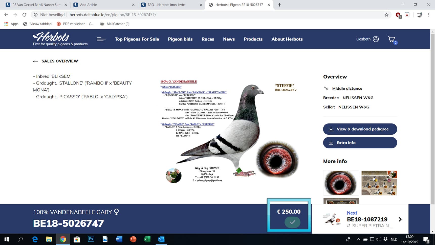 Etape 4. Vous pouvez cliquer sur le pigeon de votre choix afin de procéder à la page de détail où vous pouvez retrouver le pédigrée, la photo, l'aperçu des résultats et d'autres informations utiles.