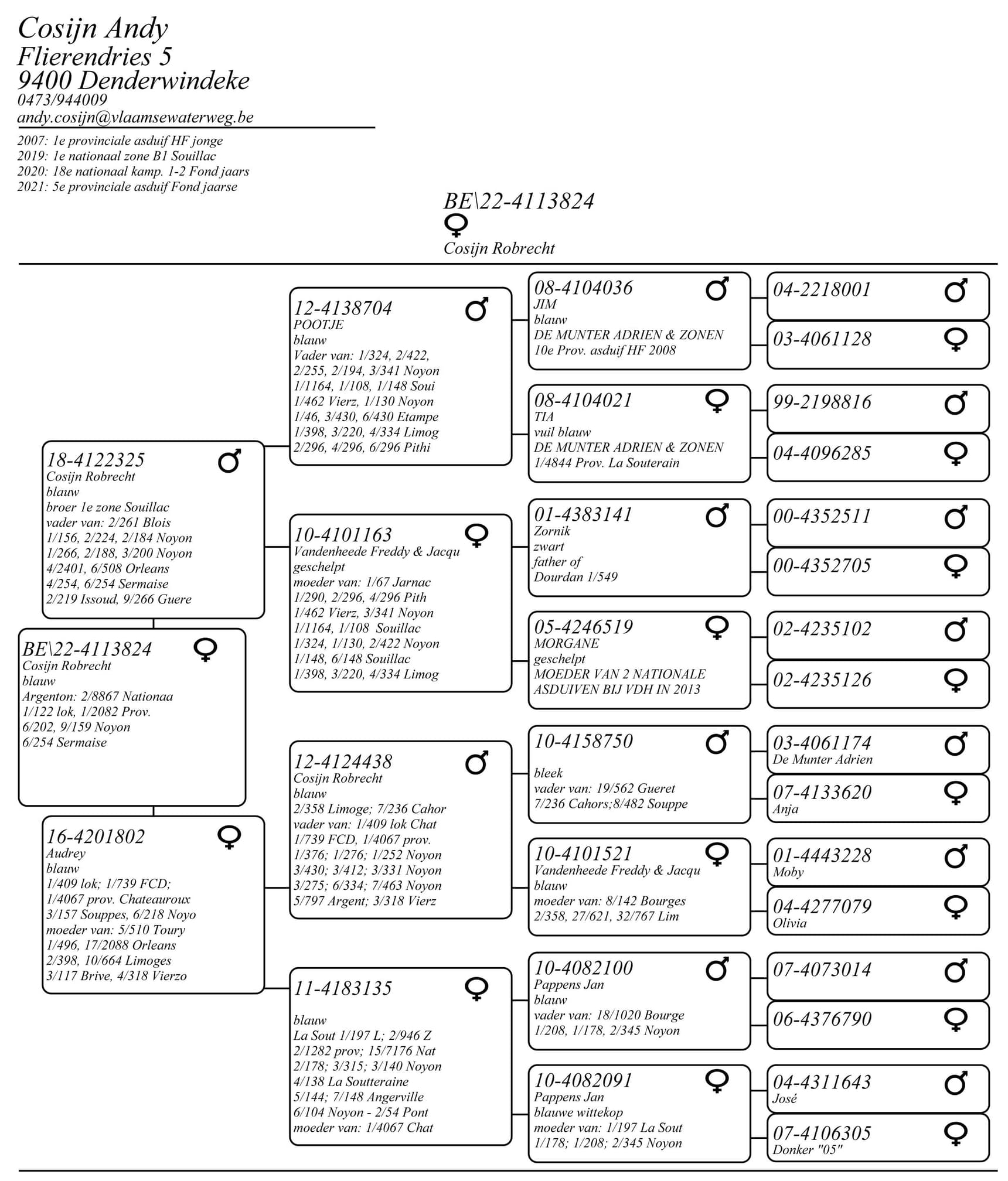 Robrecht, "nous sommes nous-mêmes un peu étonnés de la façon dont les choses se déroulent ici. La saison a connu un début "particulier" en raison de diverses circonstances. Ils ont d'abord effectué 3 vols de vitesse et un vol de moyenne distance avant de participer au vol provincial de Vierzon. Lors de ces vols, ils ont remporté les 1er et 3ème prix locaux. La semaine suivante, ils sont allés au national de Bourges, mais suite au décès de ma mère, ils n'ont pas joué. Une semaine plus tard, ils sont allés dans la corbeille pour Toury mais à cause du mauvais temps, les pigeons ont été ramenés. Une semaine plus tard, une course de vitesse (Noyon) a été choisie et, une fois de plus, ils ont commencé avec le premier prix. La semaine suivante, nous étions à la table du panier du vol national Sancoins et la femelle qui a volé 1er prix Noyon a gagné 2ème provincial et 4ème national. La saison était déjà réussie pour nous, mais apparemment la fée forme vit ici sur mon pigeonnier car sur Argenton nous avons enregistré la victoire provinciale et la 2ème nationale. C'est un vrai plaisir familial parce que ma femme Agnes et mon fils Andy (qui dirige aussi une colonie) sont tous les deux complètement impliqués dans la colombophilie. Sans eux, même la colombophilie n'existerait pas. Je les remercie pour leur aide et leur soutien.