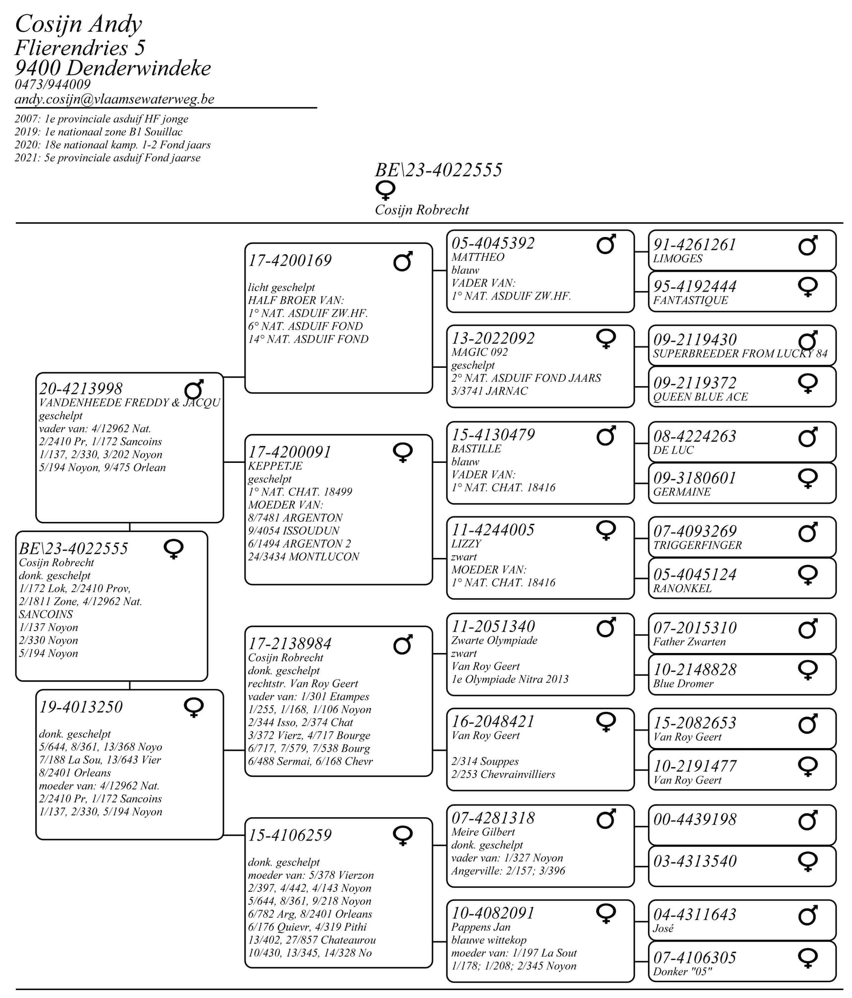 La famille Cosijn à Pollare (Ninove) se porte à merveille. Sur le Sancoins national, ils ont déjà gagné le 2ème provincial et le 4ème national contre 12.962 vieux et le week-end dernier, le bouchon de champagne a pu voler dans le ciel de Pollare parce que la victoire provinciale et le 2ème national ont pu être célébrés. Jouer le Top-5 national deux semaines de suite ! Quelle classe !