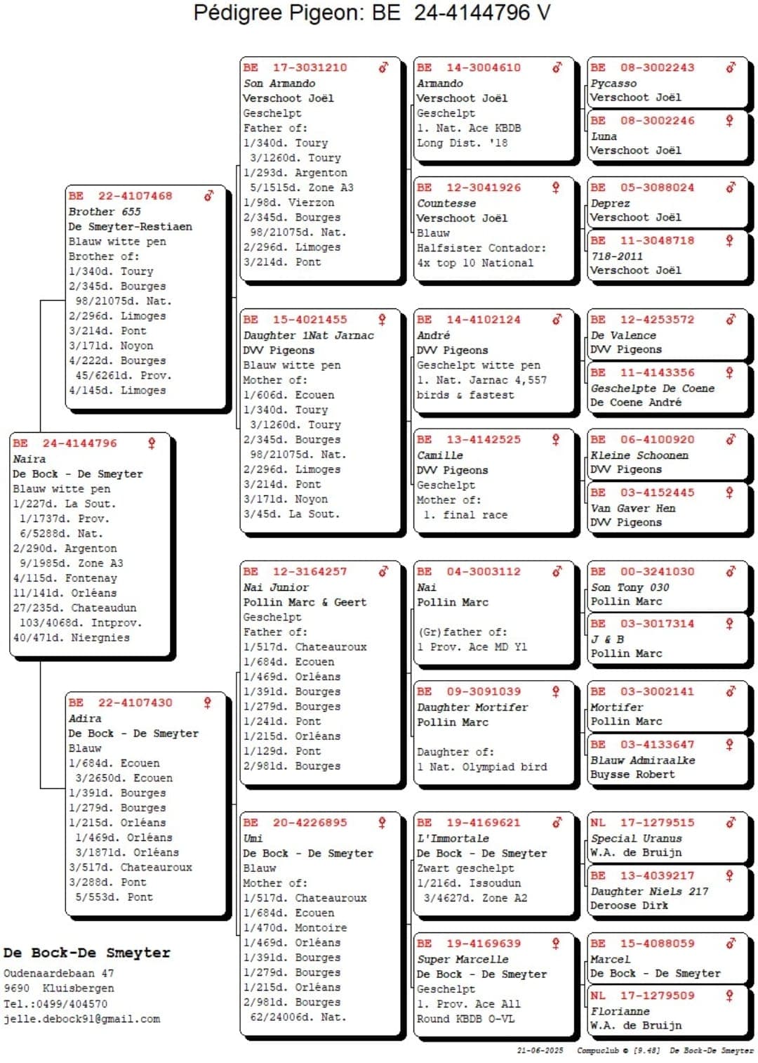A 13 h 54 et avec une vitesse minute de 1 217,21 mètres par minute pour une distance de 529 km, la femelle Naira a battu tout le peloton de la Flandre orientale (1 240 vieux oiseaux et 1 737 yearlings ont été mis en panier). Grâce à cet exploit, elle a également remporté le 6e prix national sur 5 288 yearlings, perpétuant ainsi son héritage. Normalement, elle remporte aussi le 1er prix de la zone nationale. C'est une belle femelle bleue à pointes blanches d'un pedigree très noble.
