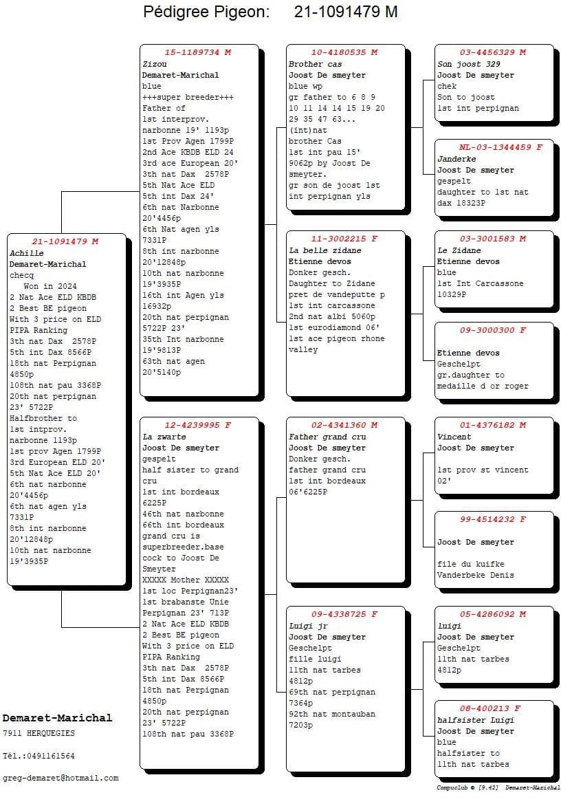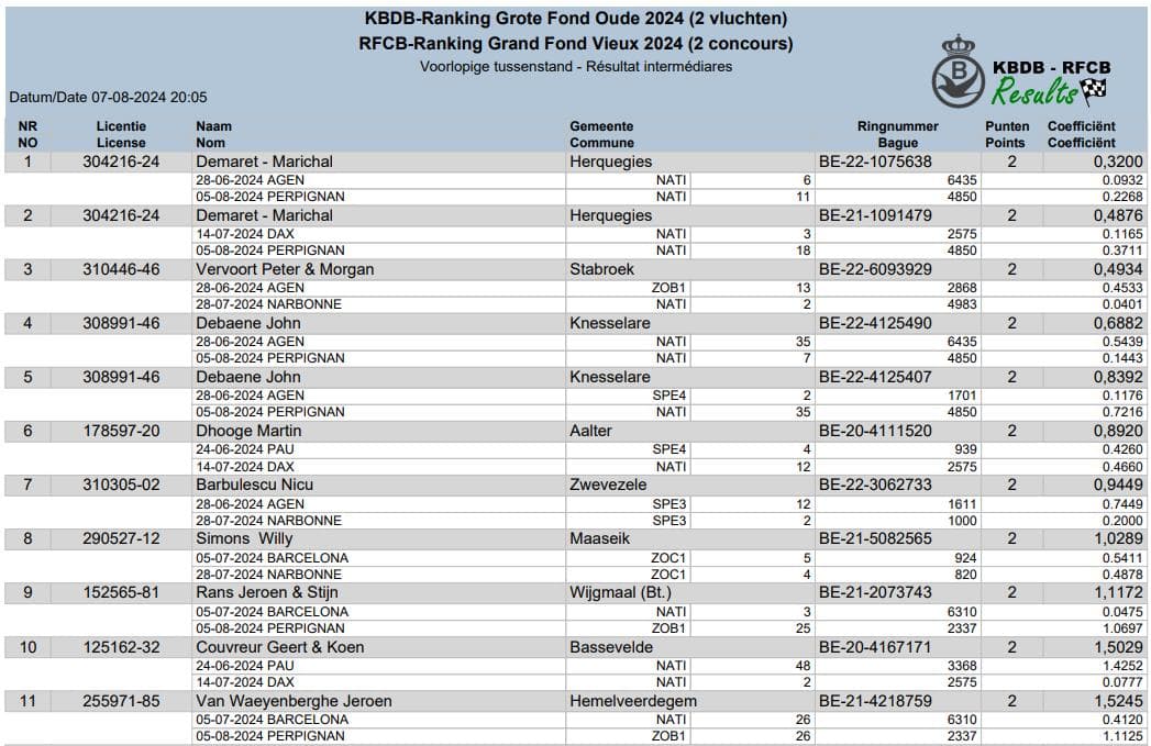 Et encore mieux, ces 2 cracks ‘ New Kleine Didi ’ et ‘ Achille ’, en plus de leurs titres d’As-Pigeon RFCB, remportent également les 2 premières places au ‘Ranking’ Grand Fond vieux 2024 (3prix) RCFB et PIPA où le Tandem DEMARET-MARICHAL classe 11 de leurs pigeons sur les 57 pigeons belges classés. Ceci pour vous dire, que vu leur domination totale dans la discipline du Grand-Fond, en cette année 2024, ils sont bien devenus les ‘ ROIS ’ du Grand Fond en Belgique.