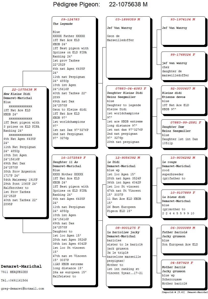 Le tandem DEMARET-MARICHAL est composé de 2 ex-sportifs de haut niveau. En effet Grégory DEMARET, 45 ans, conducteur de train, était actif dans le monde de l’athlétisme belge, puisqu’il a remporté plus de 25 courses à pied sur route du challenge ACRHO et qu’il courrait dans sa jeunesse, les 10 kms en moins de 31’. Quant à Thierry MARICHAL, 51 ans, directeur sportif actuel de l’équipe cycliste professionnelle Cofidis, il est bien connu des amateurs de sport, puisqu’il a participé en tant que coureur cycliste professionnel, à 5 tours de France, 4 tours d’Italie, 2 tours d’Espagne. A cause de leur manque de temps respectif, les 2 amis qui pratiquaient avec succès, la colombophilie, chacun de leur côté, se sont unis et ont réuni leurs forces et pigeons en 2020, pour pouvoir gérer leur hobby favori, au plus haut niveau, car Thierry et Grégory participent aux compétitons colombophiles, non pas pour faire de la figuration mais bien pour être classés dans le top des concours internationaux de Grand-Fond. Pour se faire, les tâches de chacun, sont bien réparties, Thierry MARICHAL s’occupe du pigeonnier de reproduction, vu qu’il lui est impossible de jouer les pigeons, puisque la saison des grands tours de l’équipe cycliste qu’il dirige, coïncide avec celle des concours colombophiles internationaux de grand-fond. Déchargé de la partie élevage, Grégory DEMARET peut se concentrer sur la partie sportive et compétition de la colonie spécialisée en Grand-Fond, Thierry lui apportant les pigeonneaux issus des éleveurs pour les jouer.