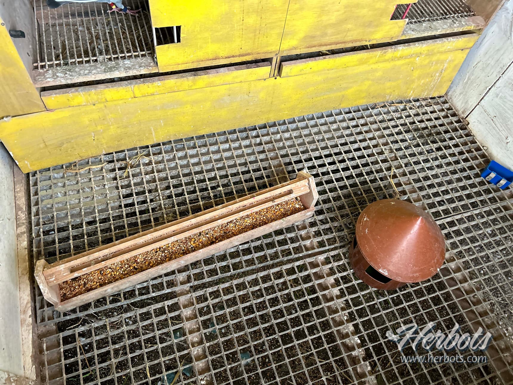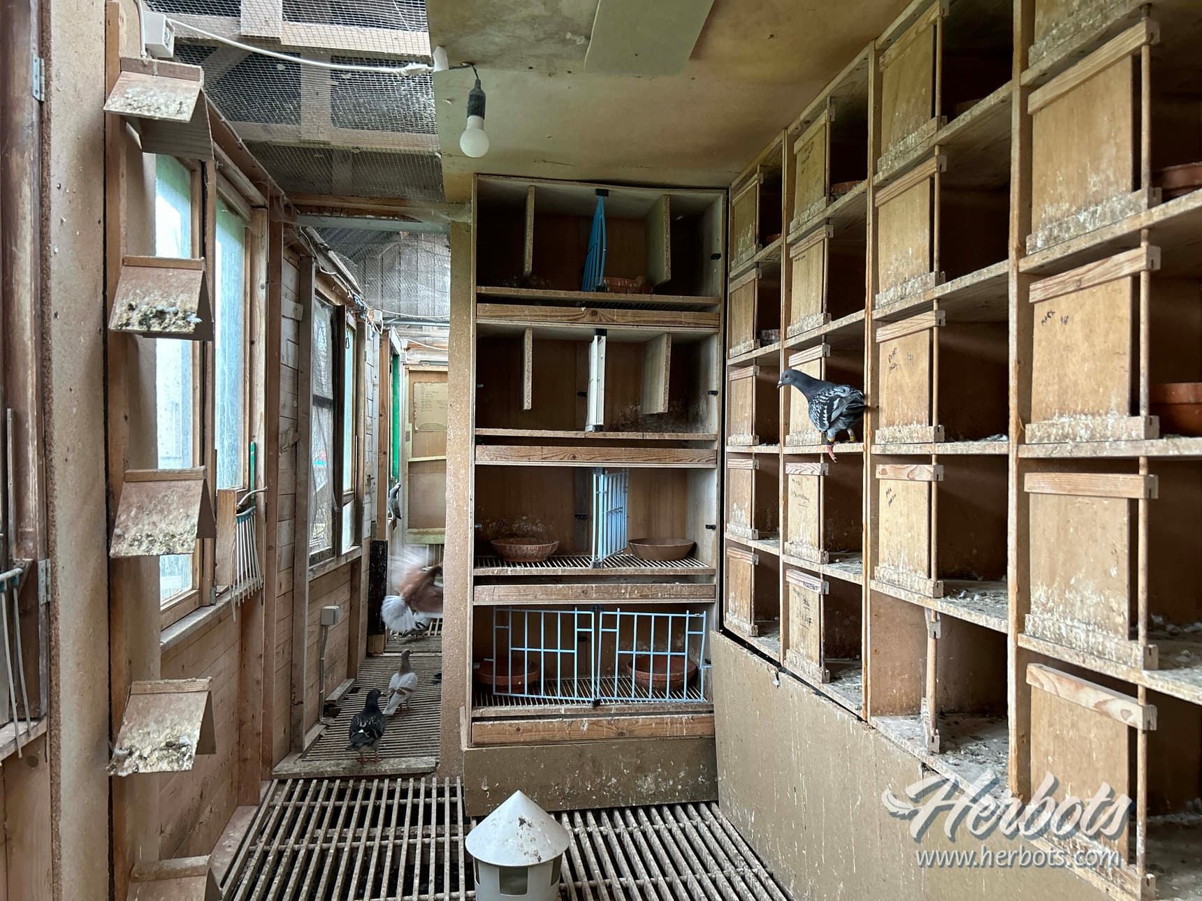 Au niveau des installations de jeu qui sont situées chez Grégory Demaret à Herquegies (dans le Hainaut occidental, près de Tournai), ce n’est pas le grand luxe et le nettoyage des casiers se fait encore à la main, mais tout est fonctionnel et bien organisé. Le pigeonnier des voyageurs adultes, se divise en 6 compartiments dont 5 de couleurs différentes (blanc, jaune, rose, vert et bleu) sont réservés pour les vieux pigeons et chacun de ces 5 compartiments peut abriter au maximum 8 pigeons. Le sixième compartiment est celui des 40 yearlings. Les trappes du pigeonnier de jeu des voyageurs adultes sont exposées à l’Est, le soleil entrant dés le matin, les pigeons sont sur des caillebottis, à 1 mètre du sol (grande profondeur) ce qui fait que les poussières ne remontent pas dans les casiers, et qui permet de leur donner un bain sans problème, à l’intérieur du compartiment. La façade en dessous du pigeonnier de jeu, est fermée de sorte qu’aucun courant d’air ne pénètre à l’intérieur des compartiments. Pour être resté un bon moment dans les pigeonniers de jeu on s’y sent vraiment bien, pas d’odeur, pas de courant d’air, peu de pigeons (8) par compartiment, ce qui veut dire que les pigeons doivent aussi l’être.