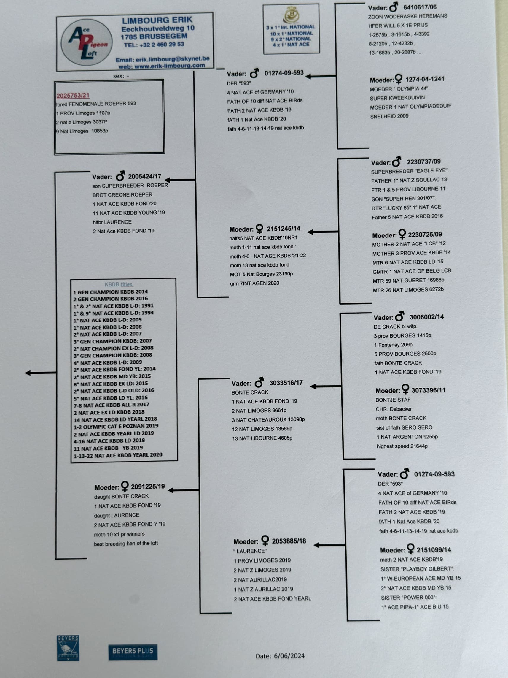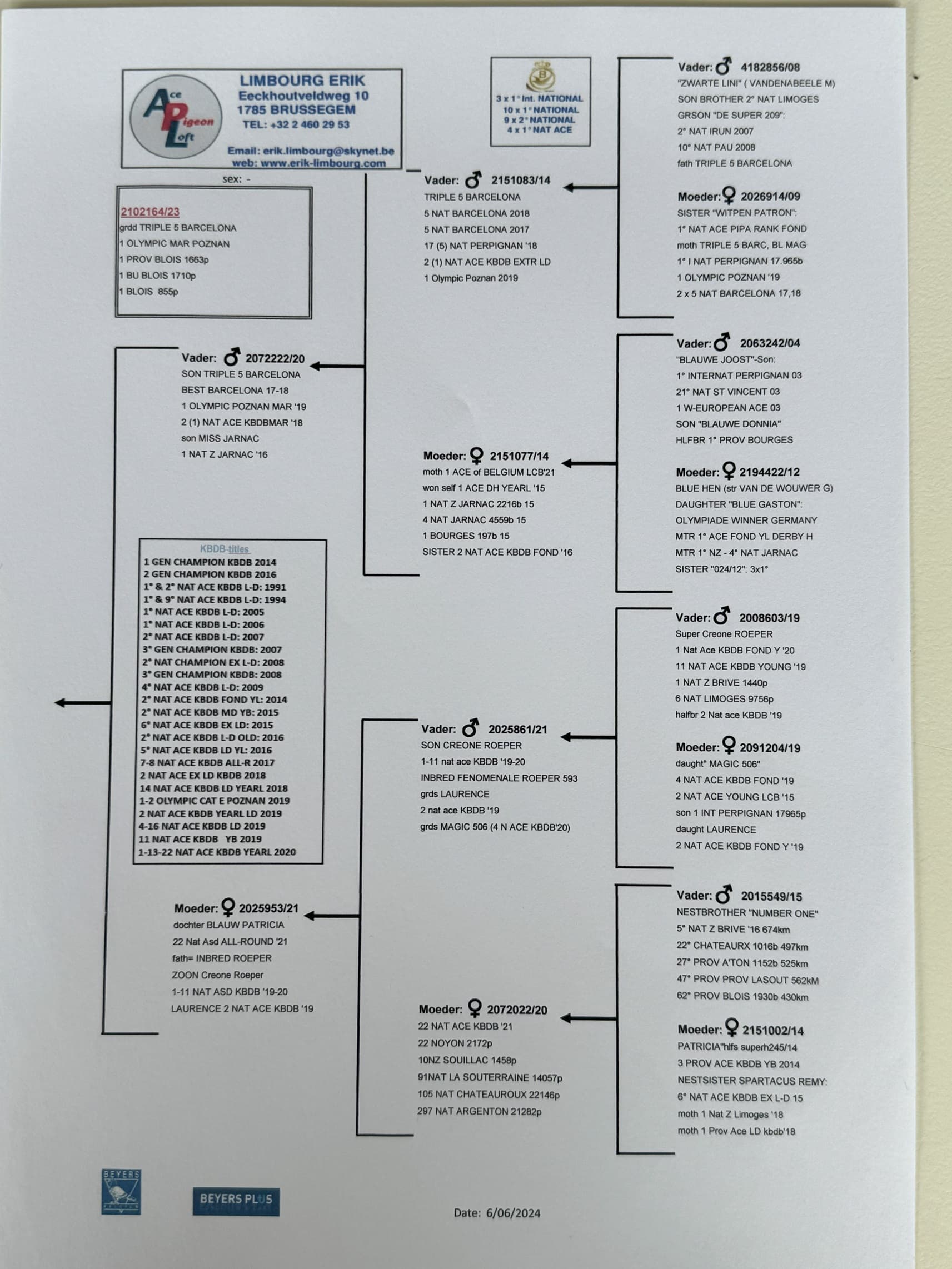 Pour Erik, cette double victoire a été un encouragement après avoir également remporté le provincial de Blois un jour plus tôt, également avec une femelle, mais chez les yearlings contre 1.710 pigeons. Cette femelle est également issue des meilleures lignées d'Erik avec « Triple 5 Barcelona » et « Creone Roeper ».