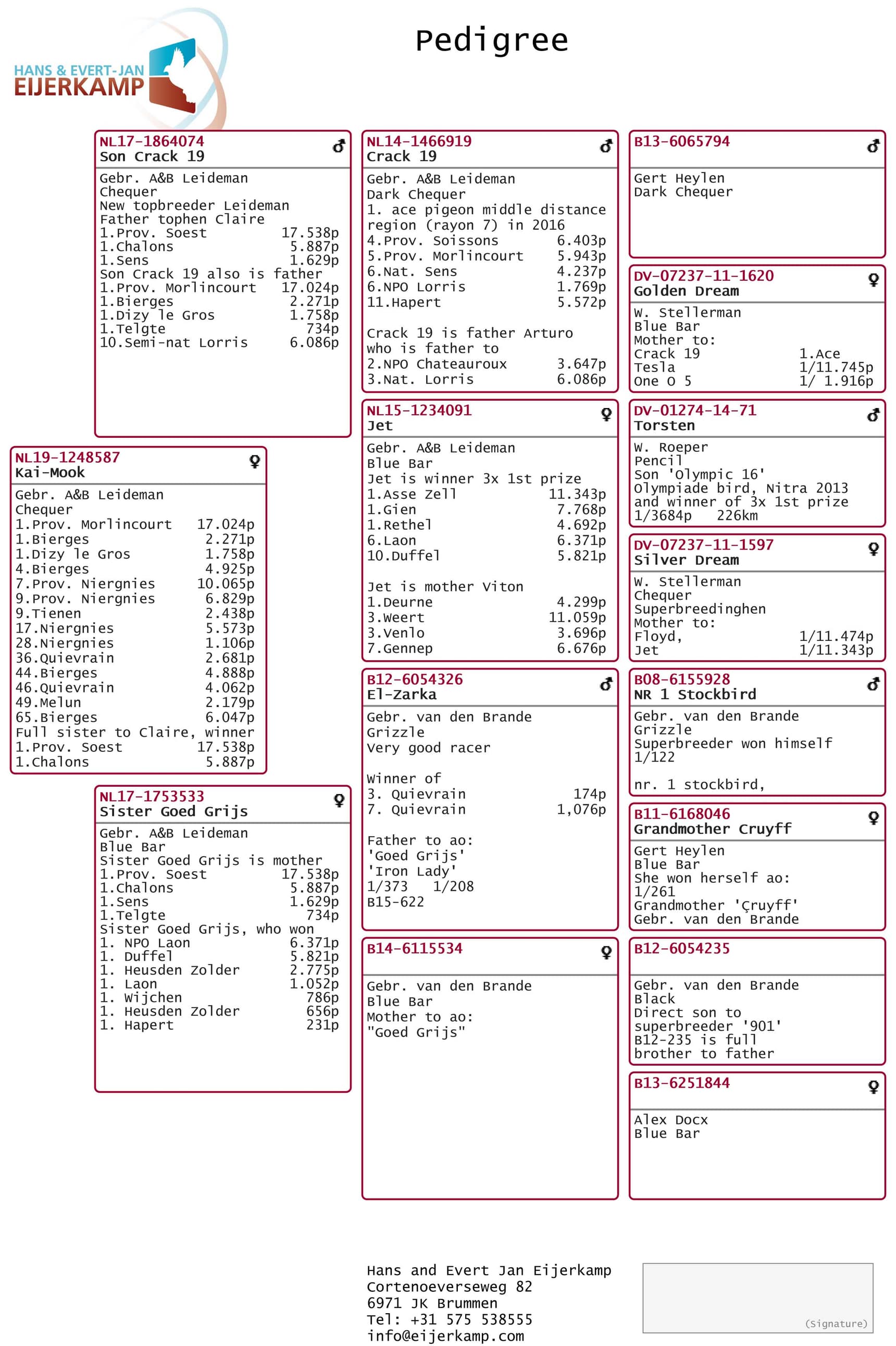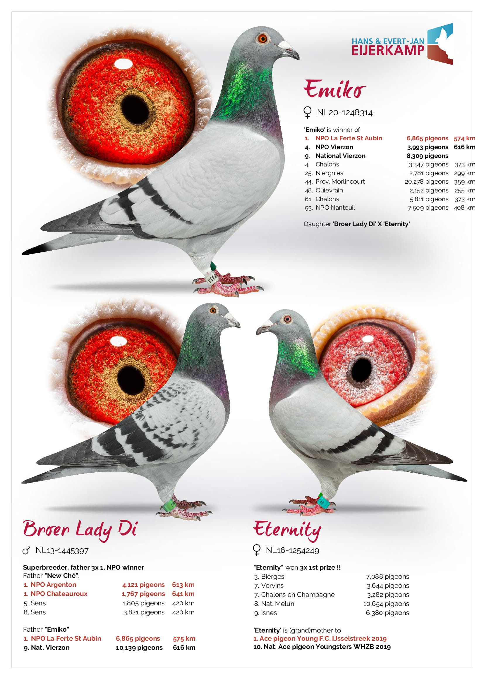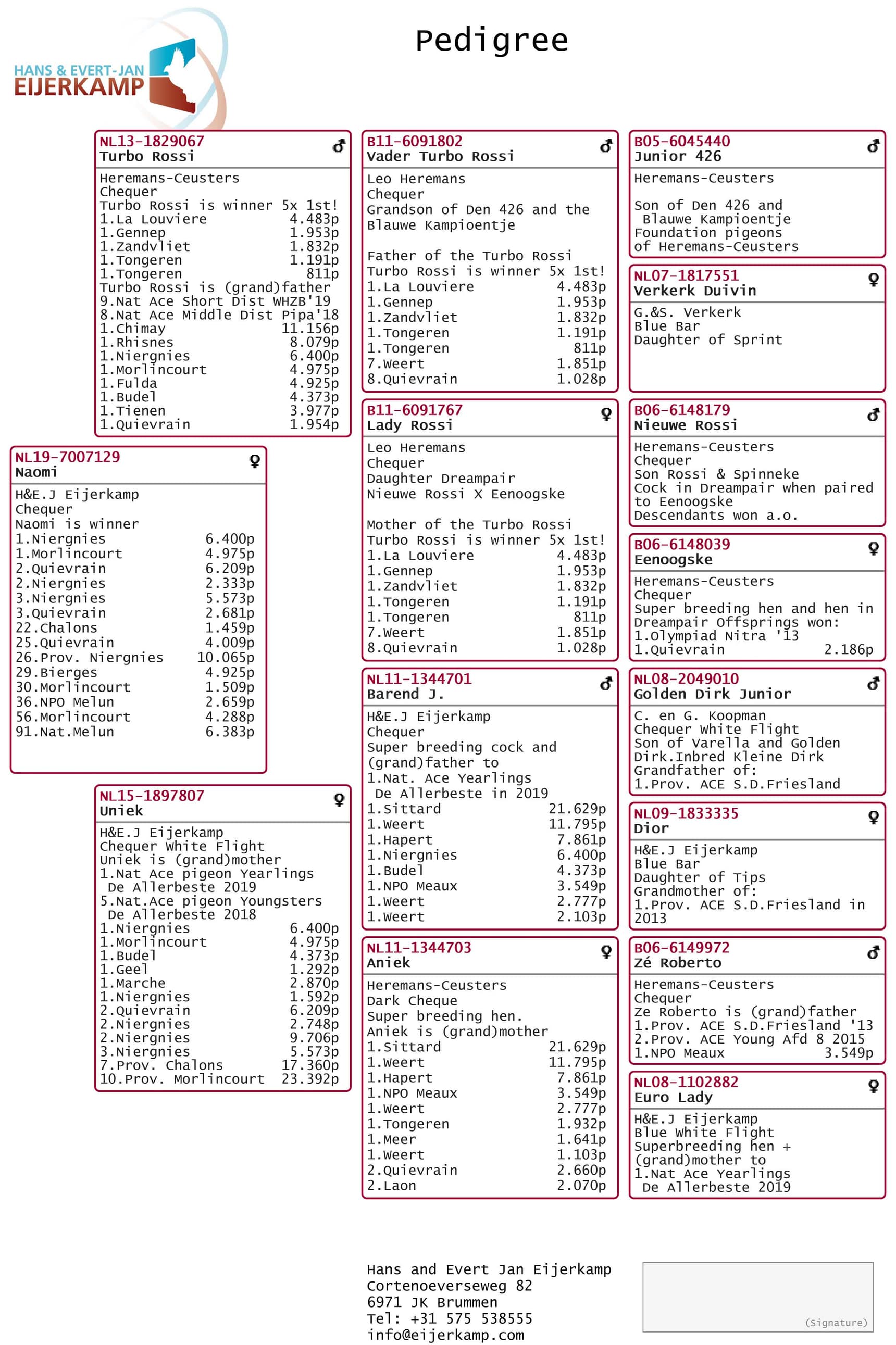 Mother” NL16-1254249 ‘Eternity’, a superb racing hen herself that won already 8th National Melun against 10,654 pigeons as youngster. As yearling she won again a lot of good results making her 13. Nat. Ace pigeon All-round with De Allerbeste. In breeding she already succeeded as a son was proclaimed 10th Nat. Ace youngster in the Middle Distance as well as her granddaughter ‘Blizzard’ won in 2021 the 1st NPO Vierzon (616 km) against 3,993 pigeons. ‘Eternity’ is bred from the superb Janssen – van Loon lines In the Eijerkamp which we also saw in the pedigree for ‘Ché’. These Janssen X Van Loon are top pigeons for distances from 100 – 700 km and now 3 years in a row the Eijerkamp lofts won 1st NPO in the One-day long distance with these golden lines.