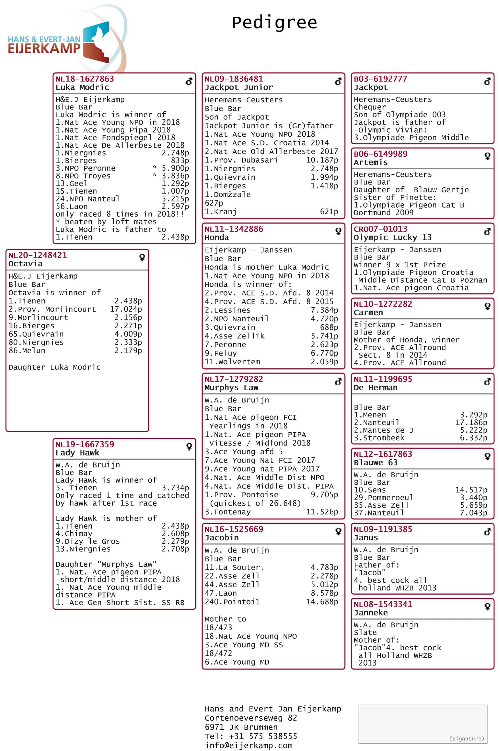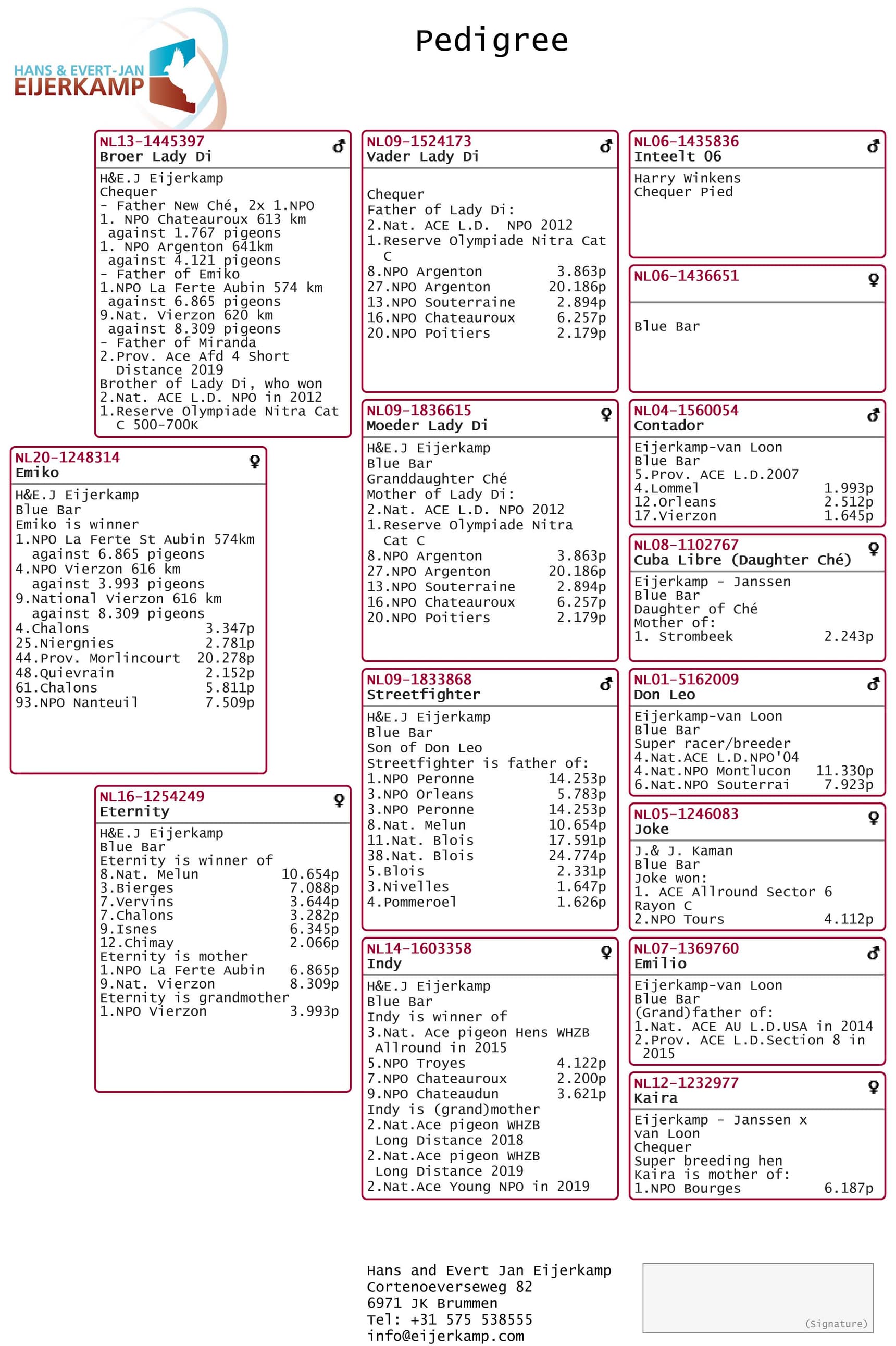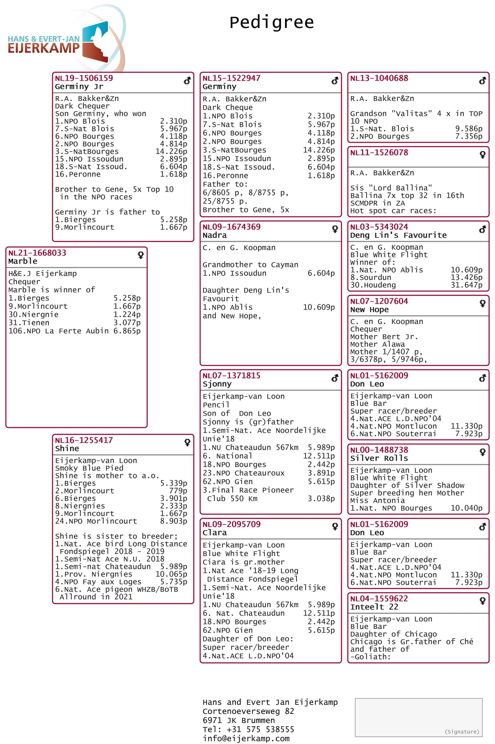 Mother” NL16-1254249 ‘Eternity’, a superb racing hen herself that won already 8th National Melun against 10,654 pigeons as youngster. As yearling she won again a lot of good results making her 13. Nat. Ace pigeon All-round with De Allerbeste. In breeding she already succeeded as a son was proclaimed 10th Nat. Ace youngster in the Middle Distance as well as her granddaughter ‘Blizzard’ won in 2021 the 1st NPO Vierzon (616 km) against 3,993 pigeons. ‘Eternity’ is bred from the superb Janssen – van Loon lines In the Eijerkamp which we also saw in the pedigree for ‘Ché’. These Janssen X Van Loon are top pigeons for distances from 100 – 700 km and now 3 years in a row the Eijerkamp lofts won 1st NPO in the One-day long distance with these golden lines.