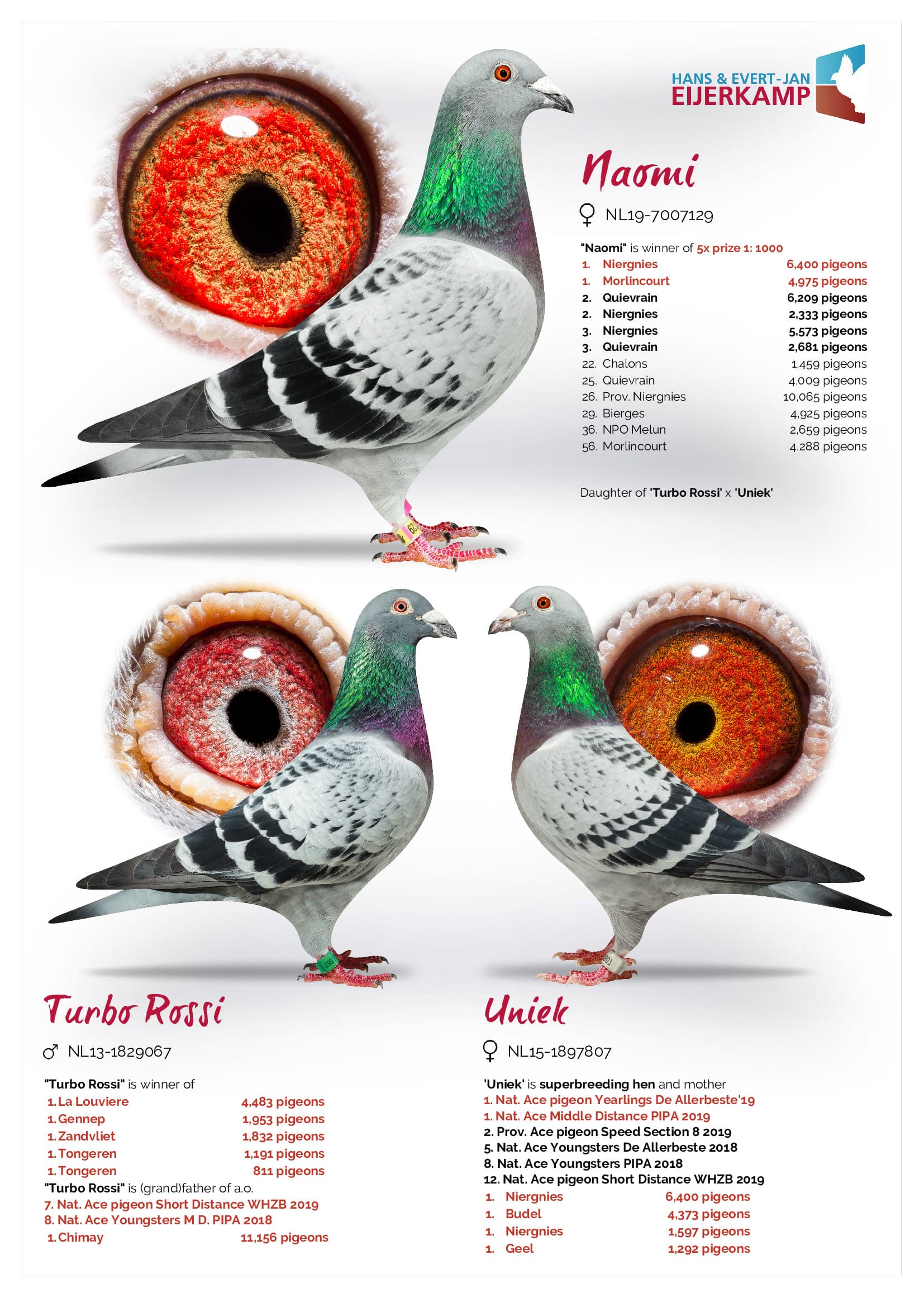 The victory was achieved by a real top hen, as ‘Naomi’ now won her second victory in big list. This also was now 5x 1:1000 which is exceptional of course. The genes for winning also floating in here veins as she is daughter of ‘Turbo Rossi’, a superb Heremans cock who won himself 5x 1st prize and who in meantime is father, grand- and great-grandfather of many winners and ace pigeons. Mother to ‘Naomi’ is super breeding hen ‘Uniek’ who is daughter of the legendary pair ‘Barend J’ (Koopman x Janssen) x ‘Aniek’, granddaughter of ‘Euro’.
