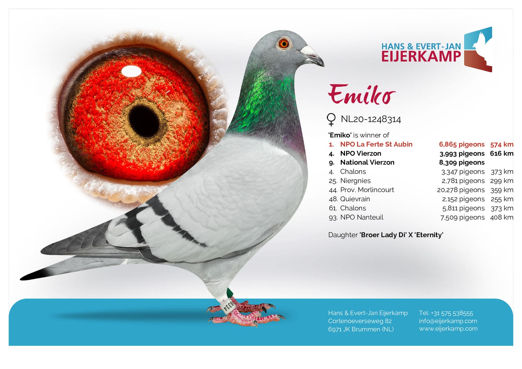 The race was a tough race and the 6,865 pigeons were liberated at 07.00 hrs. in La Ferte Saint Aubin with a light northeastern wind. The winner, NL20-1248314 ‘Emiko’, was clocked at 14.53.06 making a speed of 1,213 m.p.m. She was entered 1st nominated pigeon while she already had set a very good record last year already winning a.o. 4th NPO and 9th National Vierzon against 8,309 pigeons. This season she won 4 prize cards so far, 2 weeks ago, she won 40th Provincial Morlincourt (359 km) against 20,278 pigeons. She was coupled early February and after she raised some youngsters, she was placed on the widowhood system.