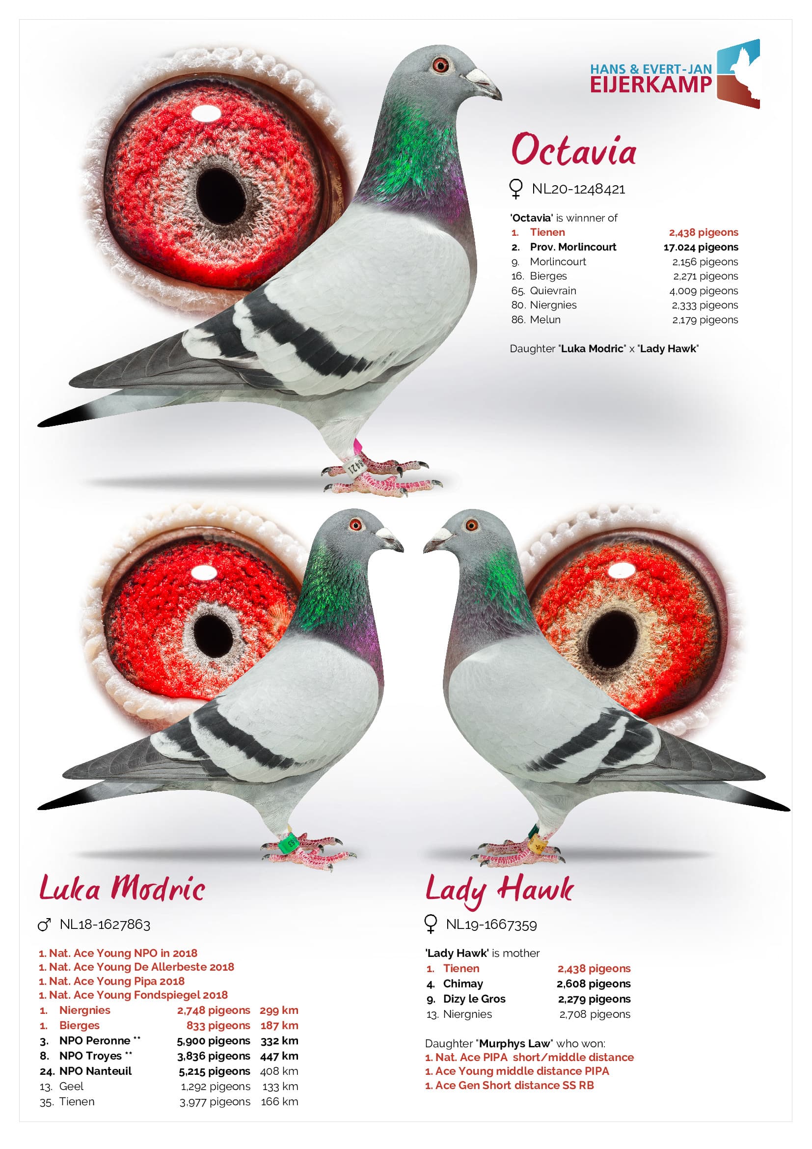 The 2nd Provincial winner is ‘Octavia’ who already won 1st Tienen against 2,438 pigeons in the 2021 season. She is daughter of ‘Luka Modric’ who was the revelation in the 2018 season in which he won 2x 1st prize and was crowned 1st National Ace pigeon with the youngsters. Mother to ‘Ocatvia’ is ‘Lady Hawk’, a daughter of ‘Murphy’s Law’ of Willem de Bruijn.