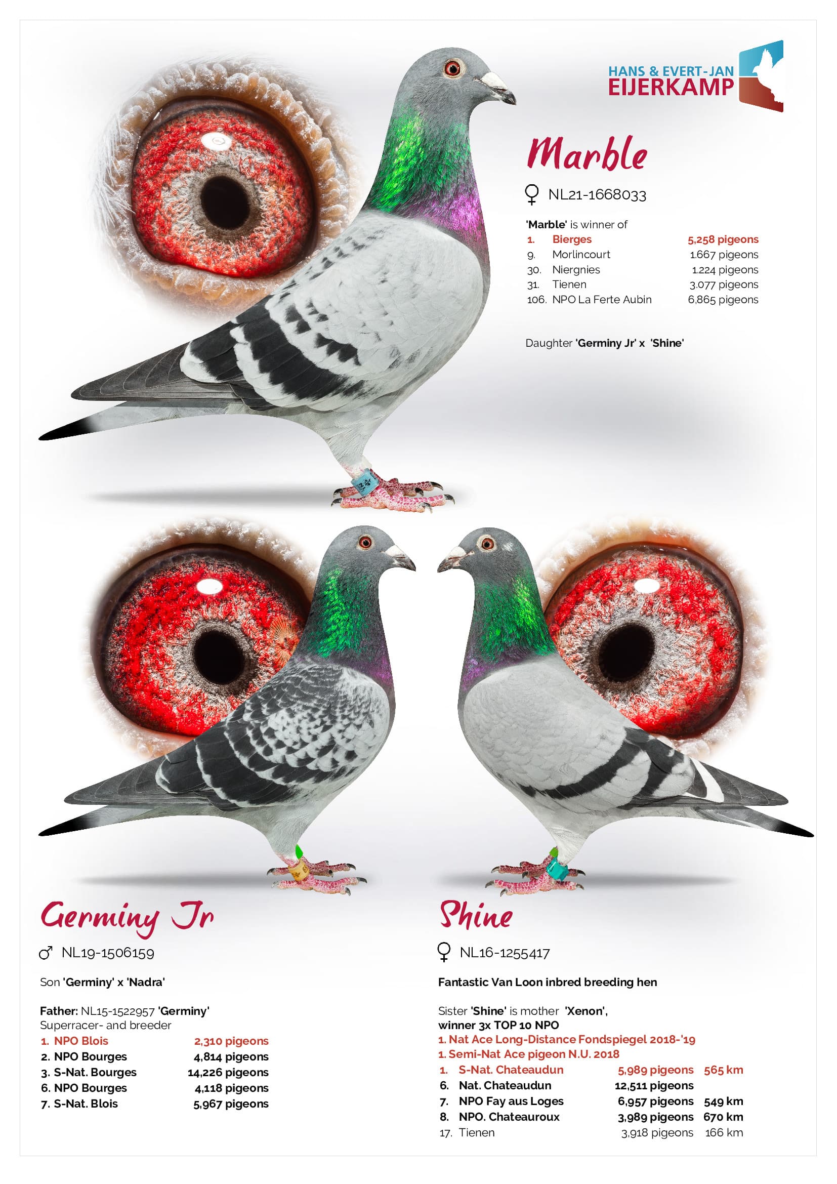 She is bred from ‘Germiny Jr’, son of the great champion ‘Germiny’ of Dolf and Ruud Bakker from Zoelen, while mother ‘Shine’, is a superb Van Loon breeding hen, inbred to the legendary ‘Don Leo’/