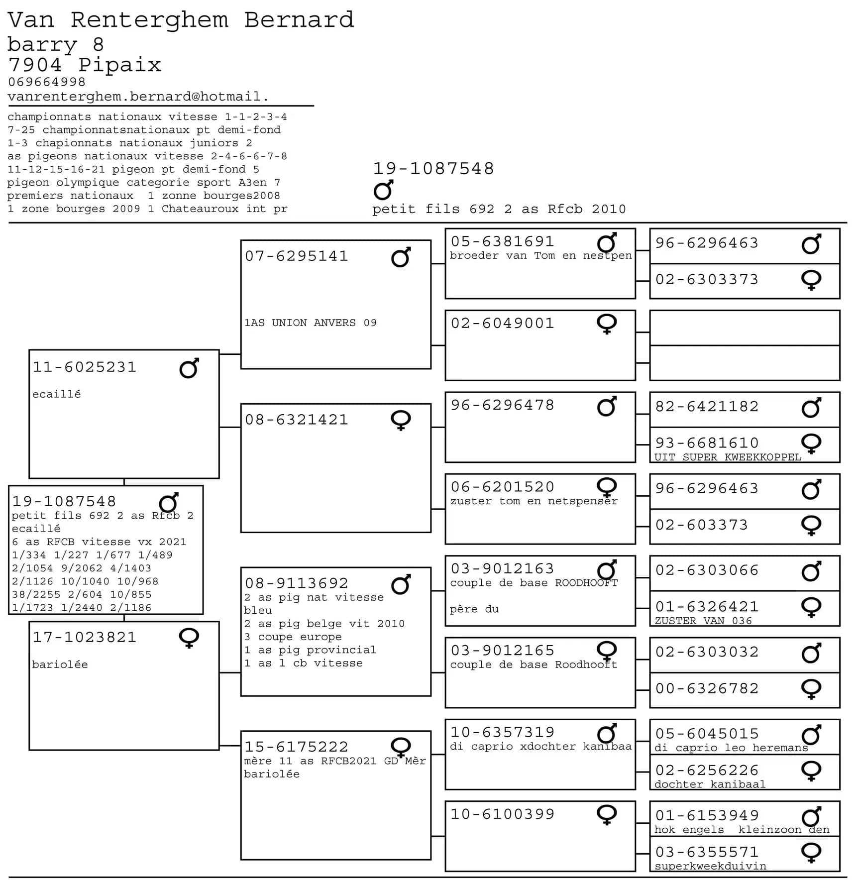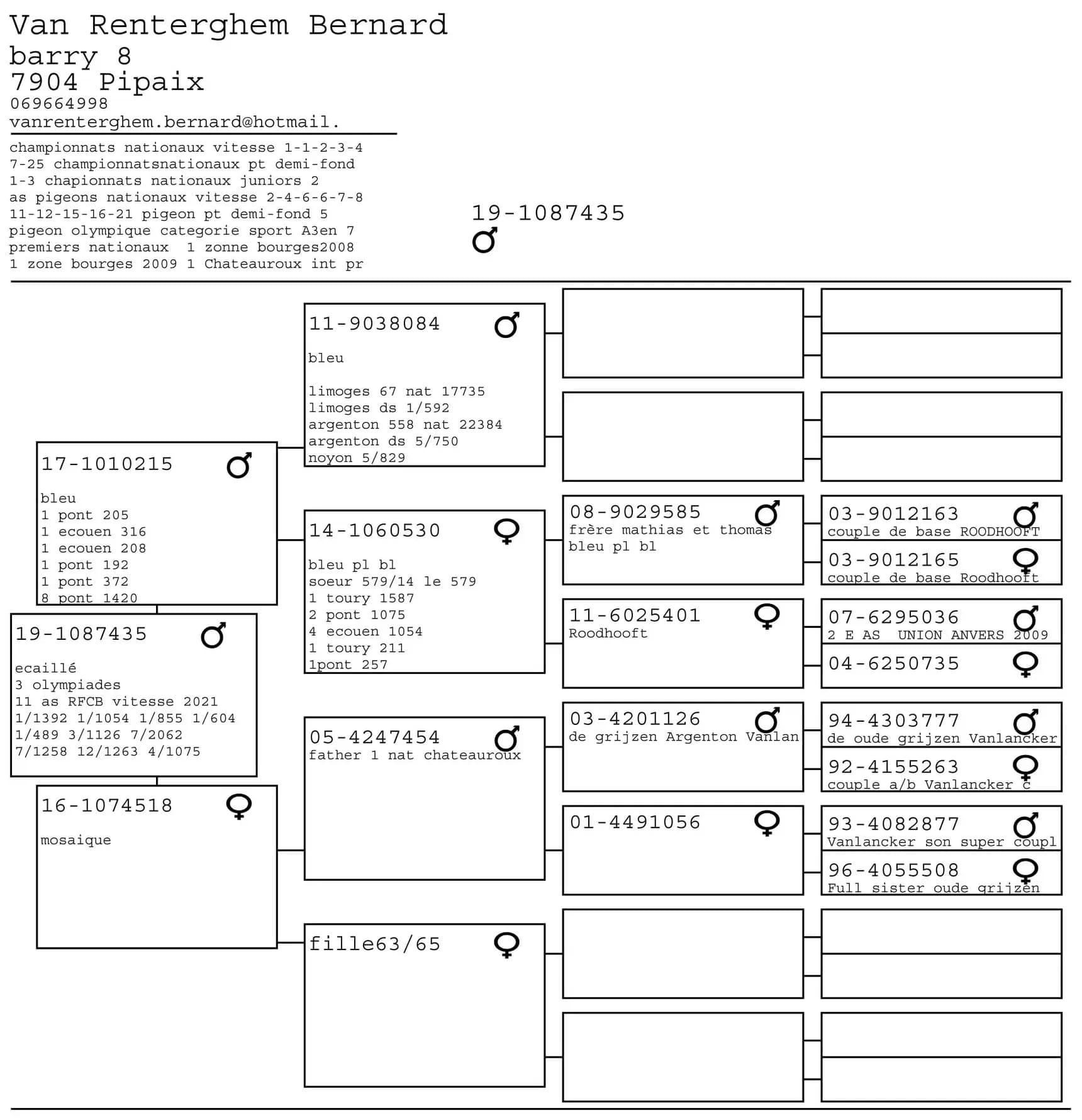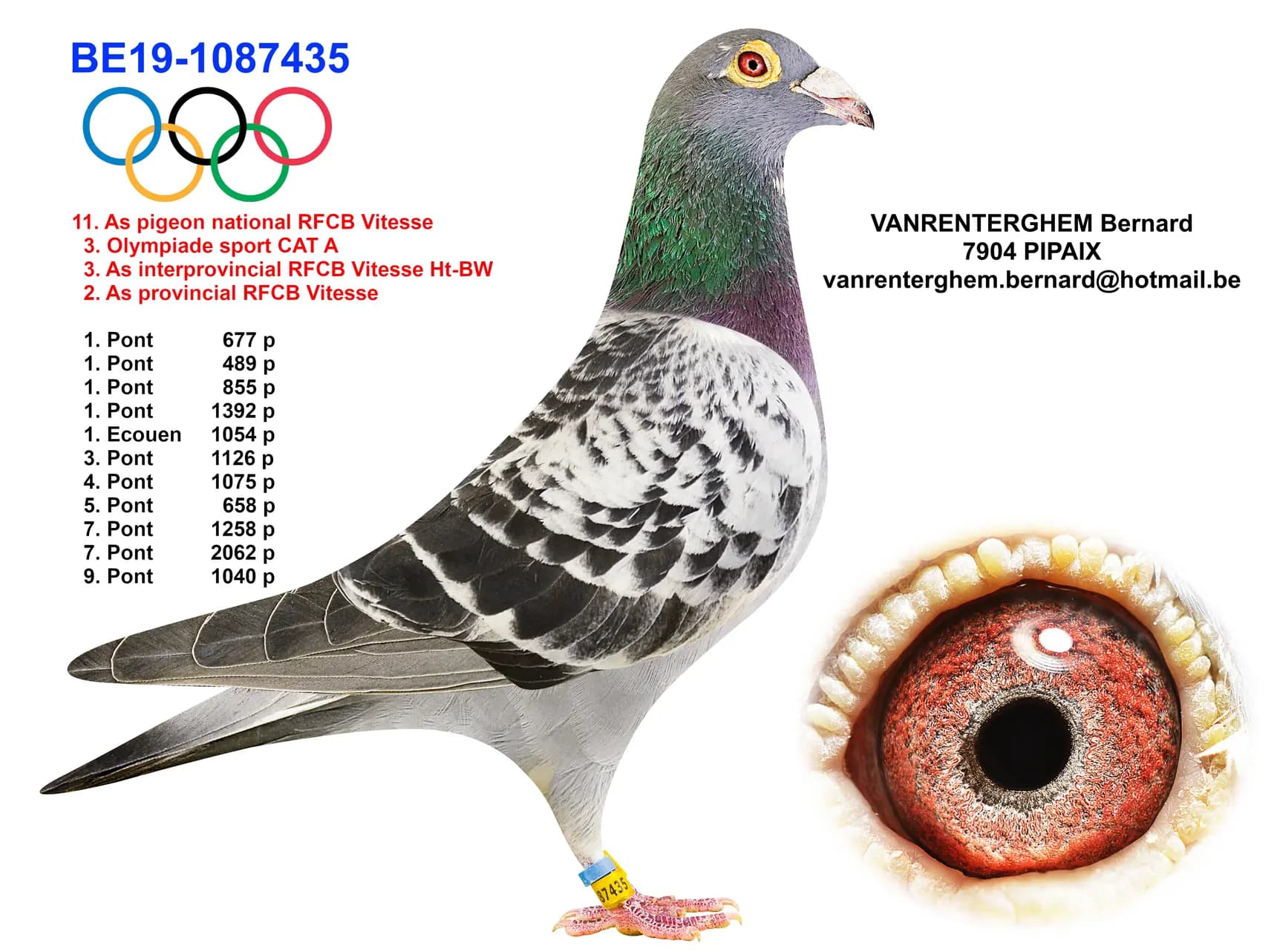 - Nonckelynck-Verriest (Herseaux) 3ème Nat. Narbonne 2020 et 8ème Nat. Narbonne 2019 (la mère de ces 2 pigeons est une 100% Van Renterghem)