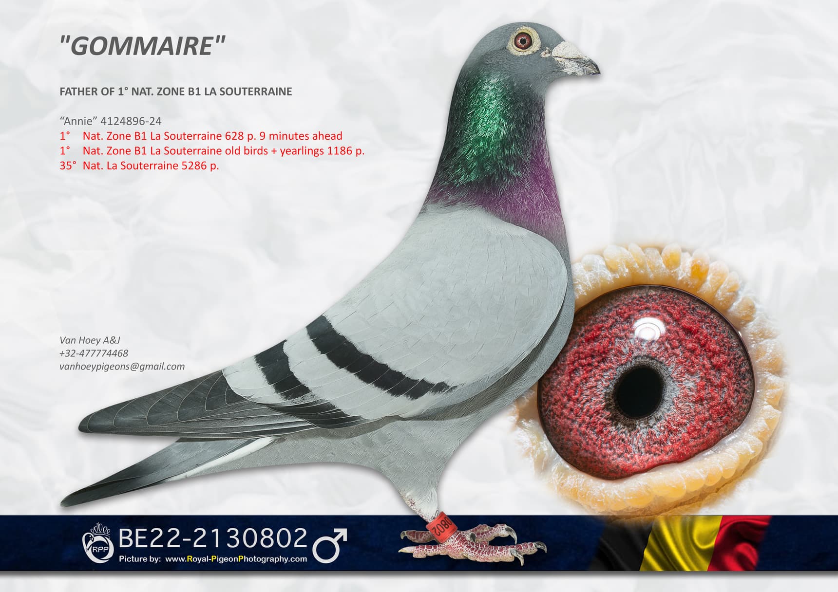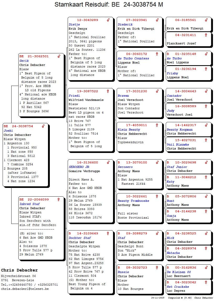 Ce BE 22-2066040 Jaguar 040 est désormais le père de deux super yearlings, « Jag 002 » et « Jag 004 », qui affichent déjà des palmarès impressionnants et figurent assurément parmi les favoris pour 2026. La stratégie est définie, et Gommaire continuera de développer à la fois « Jaguar 040 » et ses deux as nationaux, « Lotte » et « Noor », en les combinant avec des croisements avec d'autres pigeons de haut niveau et avec sa propre lignée.