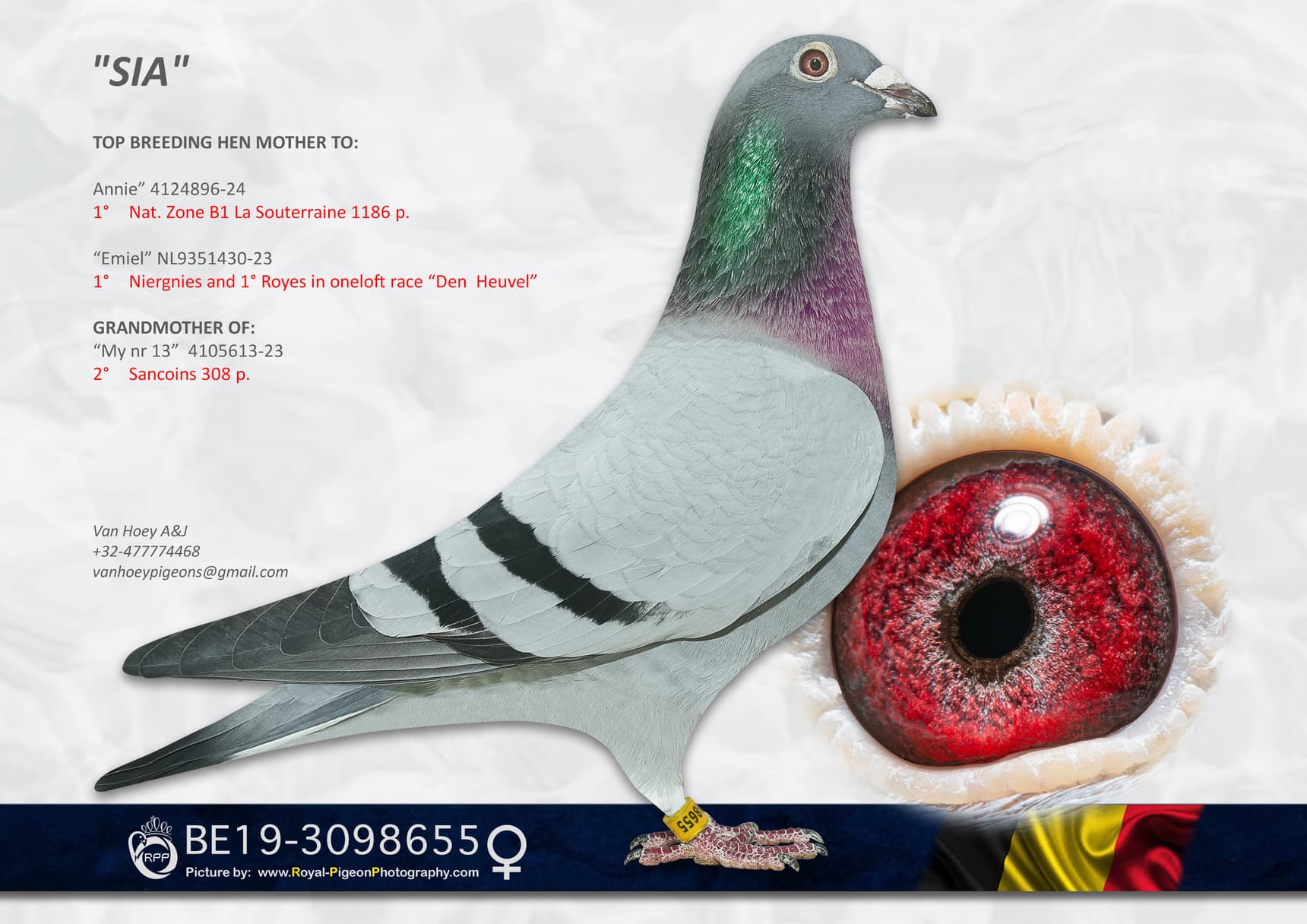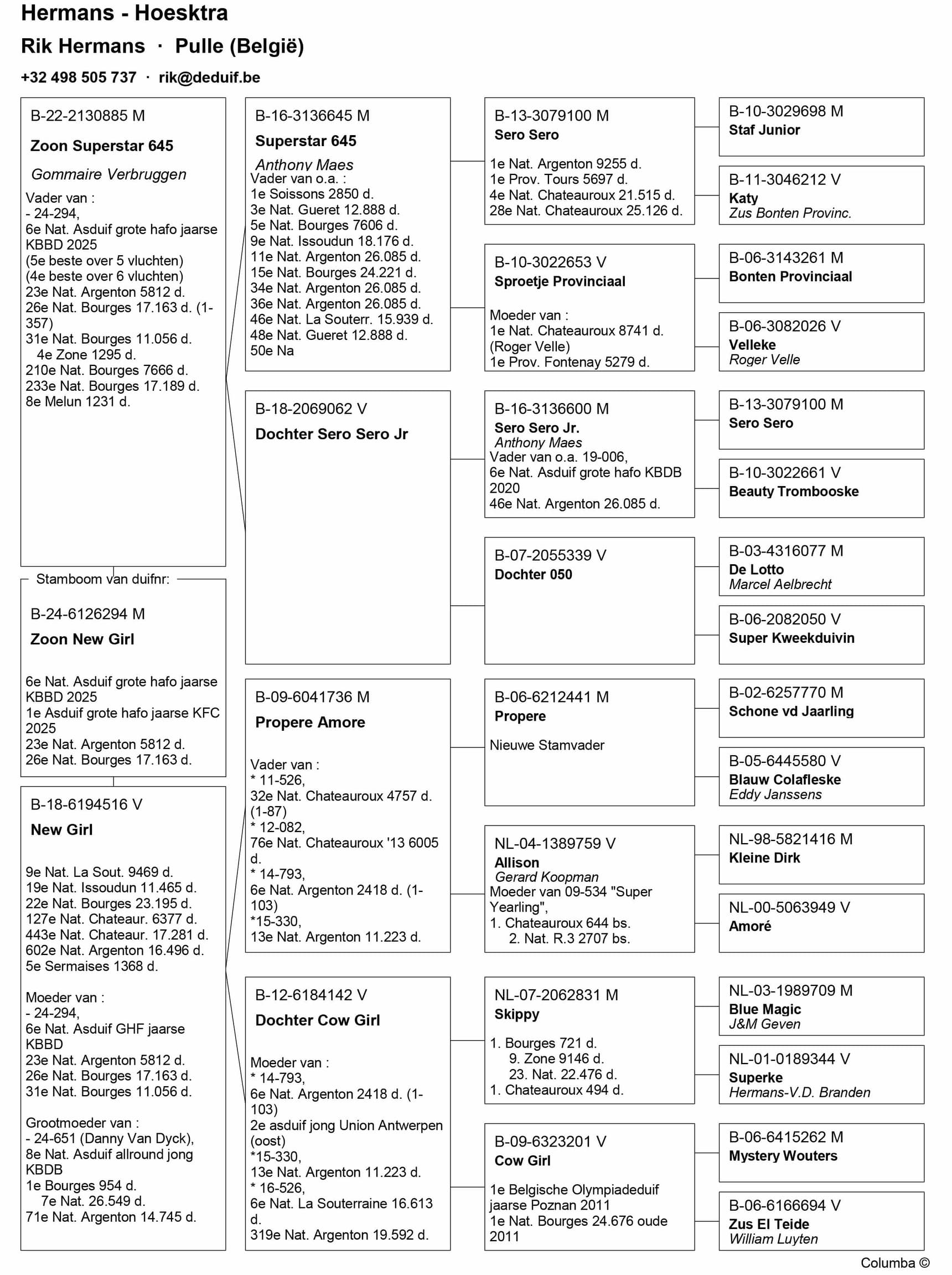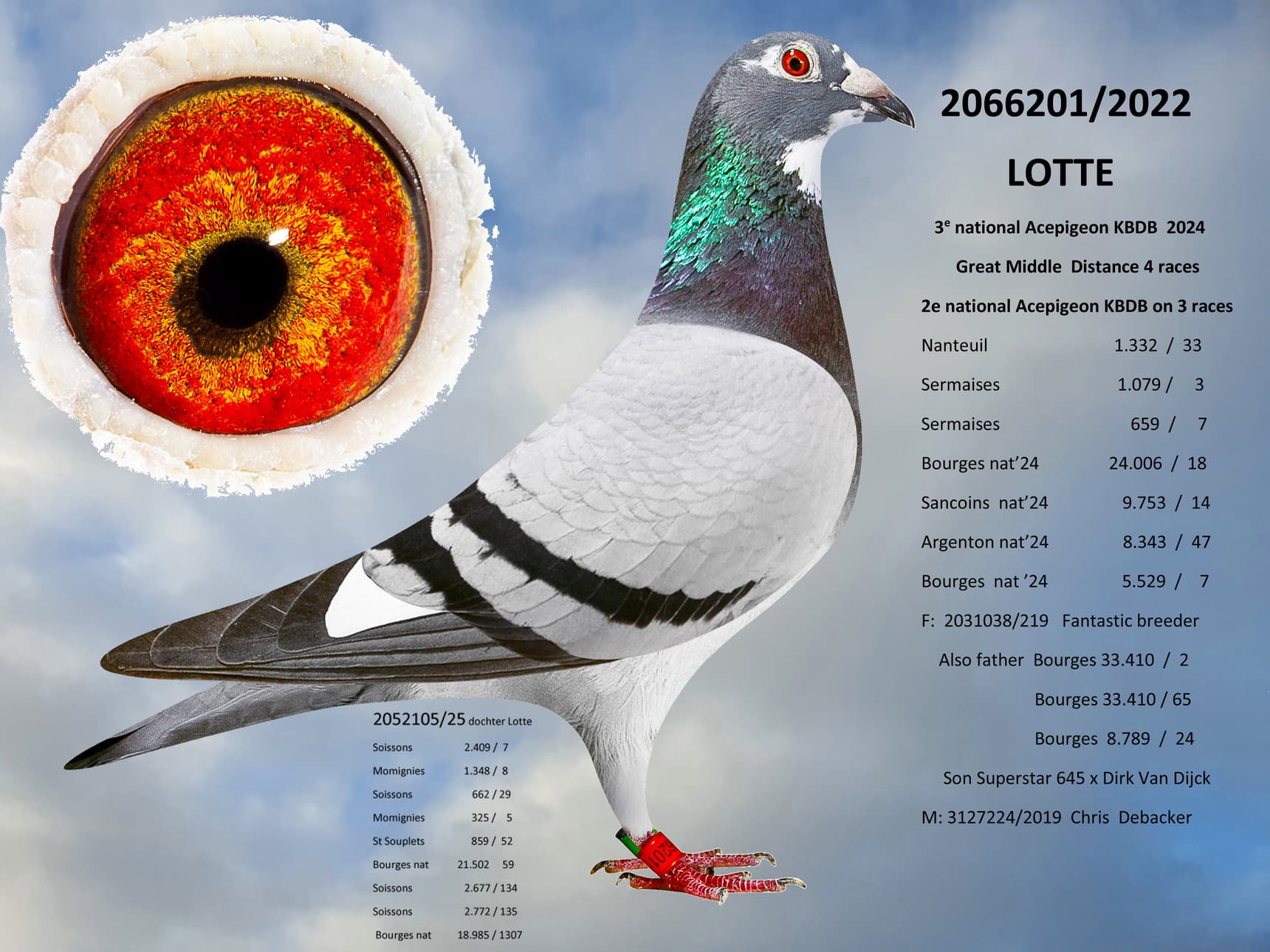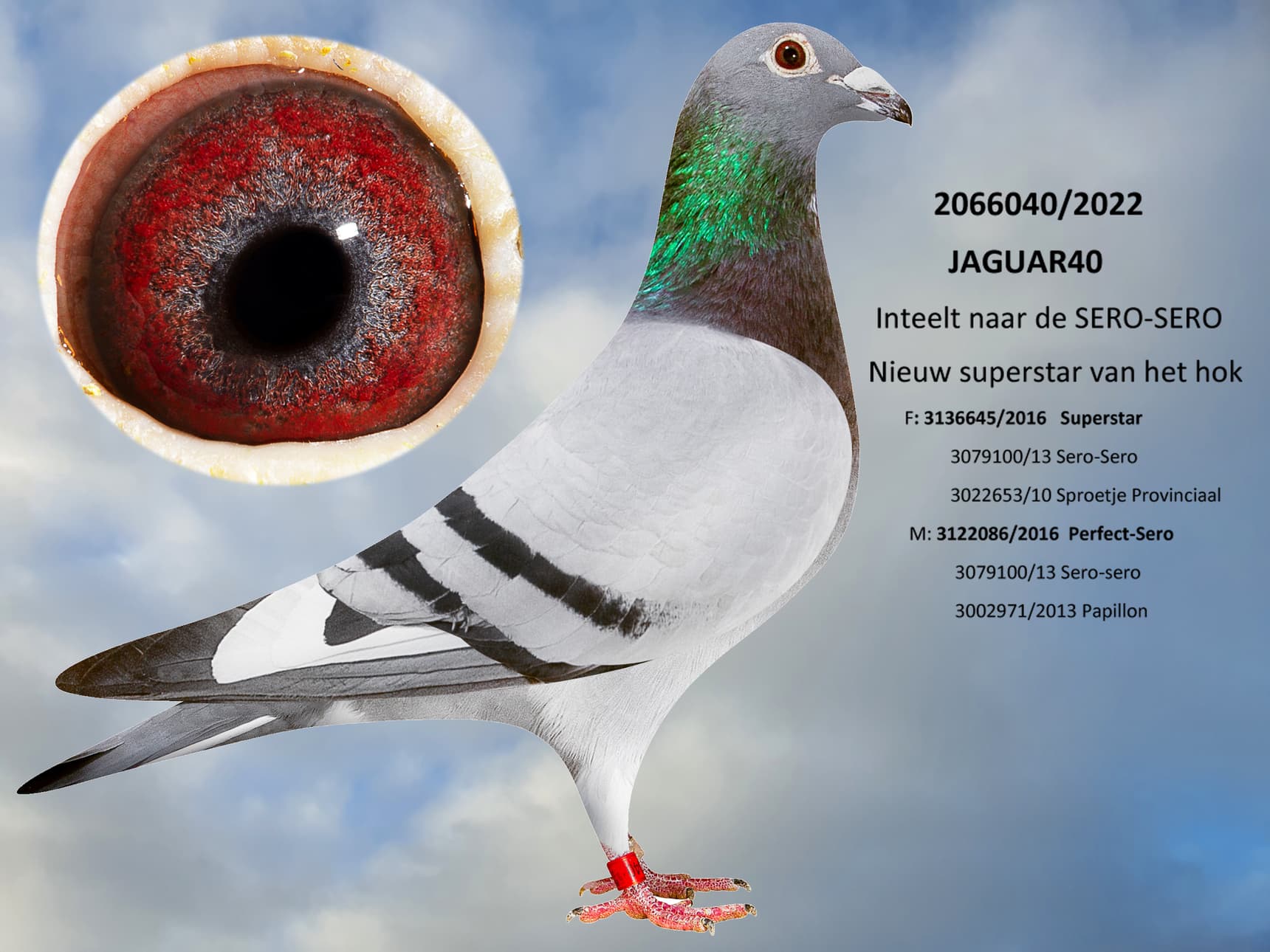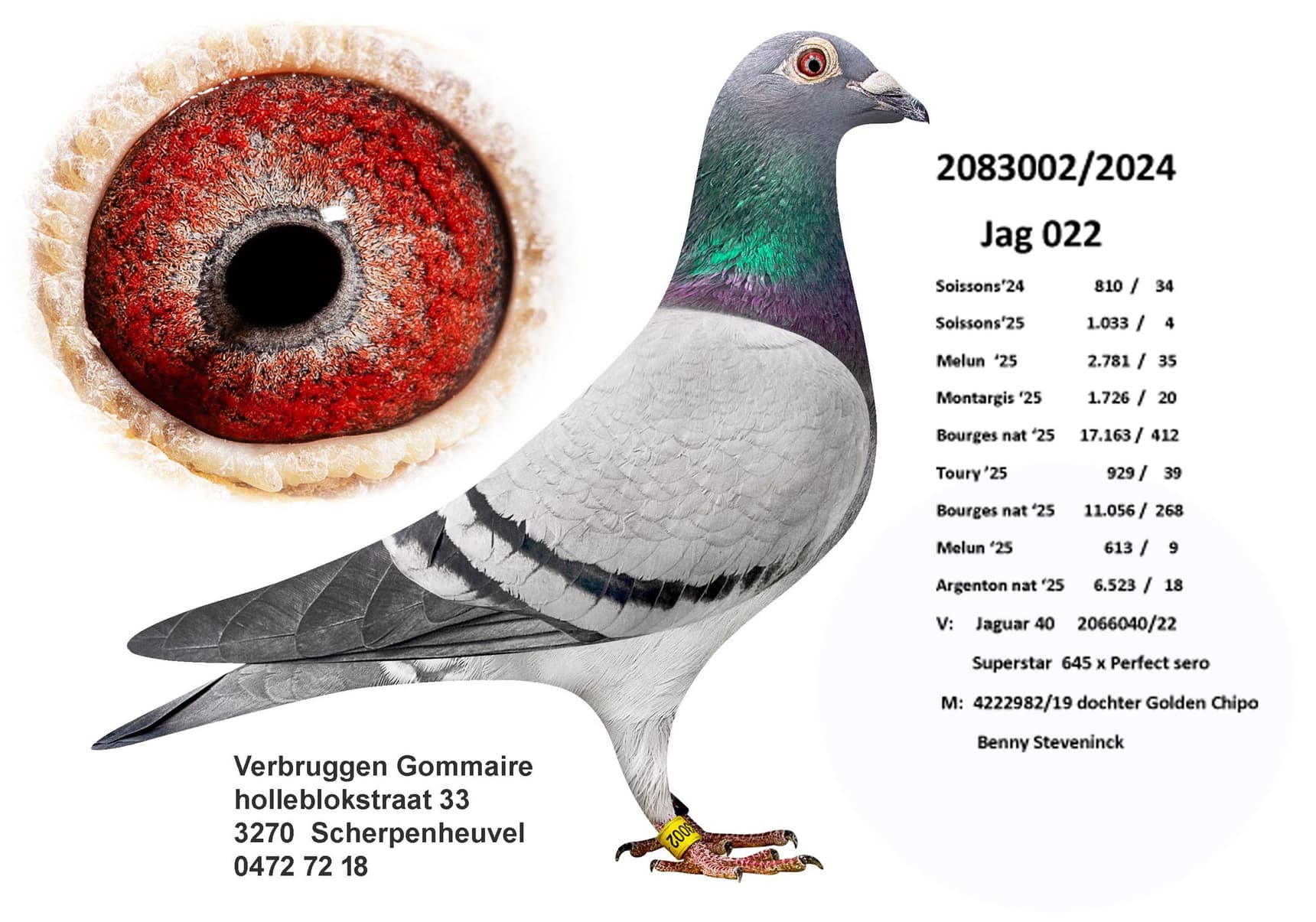 Ce pigeon est issu d'un croisement exceptionnel entre « Superstar 645 », fils d'Anthony Maes, Meilleur Éleveur de la famille Verbruggen, et « Perfect Sero Sero », fille de « Sero Sero », 1er Nat. Argenton (9 255 pigeons), et de « Papillon », 1er Prov. Tours (5 697 pigeons), tous deux élevés par Anthony Maes. « Superstar 645 » est également un fils de « Sero Sero », formant ainsi un accouplement entre un demi-frère et une demi-sœur. Ce pigeon est un véritable plaisir à tenir en main : un plumage dense, une musculature souple, une silhouette harmonieuse et un regard exceptionnel.