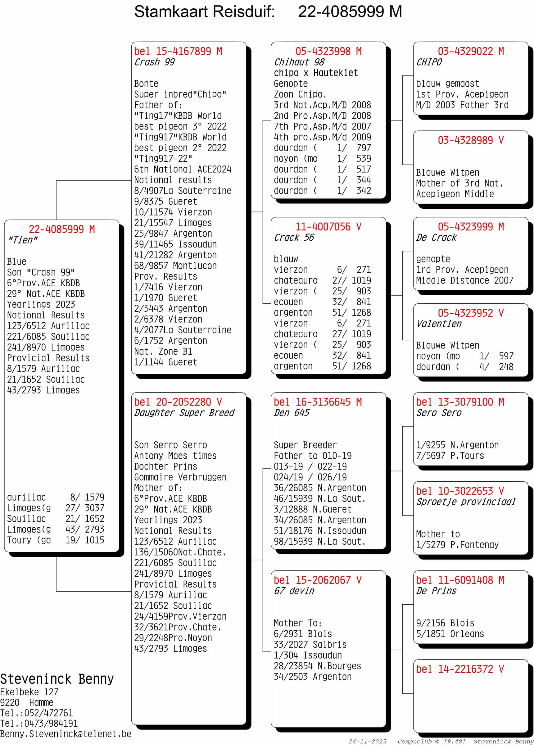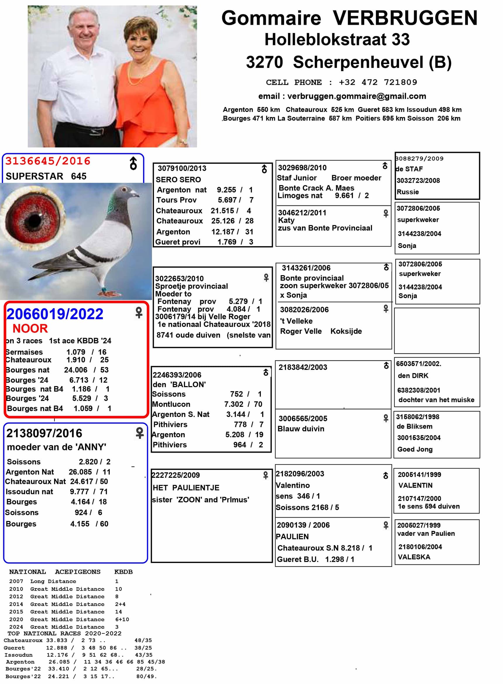 Le dernier de cette liste est sans doute le meilleur qu'il ait jamais possédé. « Superstar 645 » est un pigeon Anthony Maes direct, et parfois, une image vaut mille mots. Au total, les descendants directs ont figuré 24 fois parmi les 100 meilleurs pigeons au niveau national, et leurs petits-enfants dépasseront ce nombre à de nombreuses reprises, pour un total actuel d'environ 70. En observant les meilleurs pigeons actuels, on constate que plusieurs petits-enfants excellent, et que des arrière-petits-enfants ont remporté des prix nationaux prestigieux. Cette lignée continue de transmettre ses gènes exceptionnels.