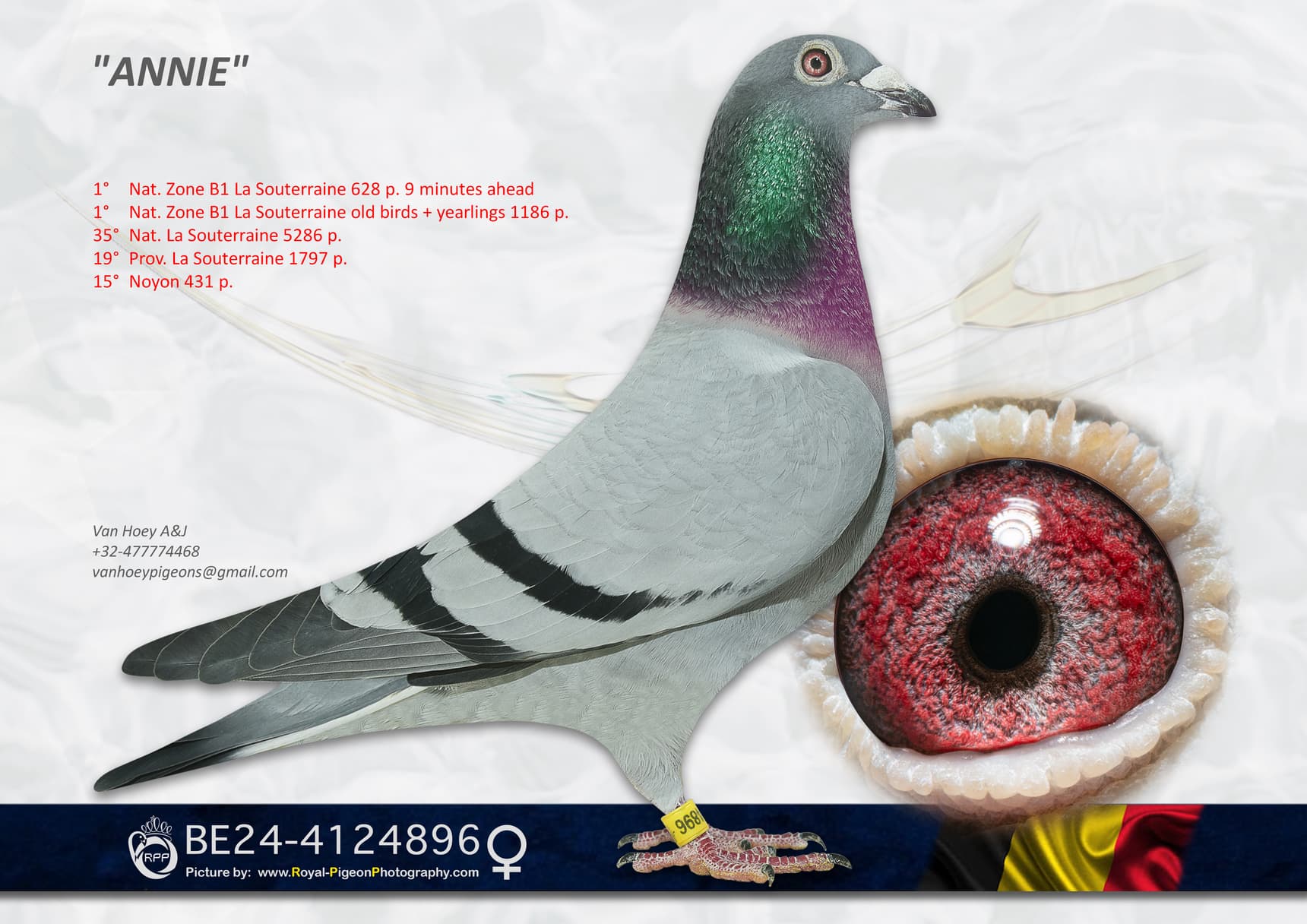 Cette dernière femelle est une soeur de plusieurs super pigeons dont 2 + 3 Nat (z) Bourges 4,164p - 3 Nat Gueret 12,888p