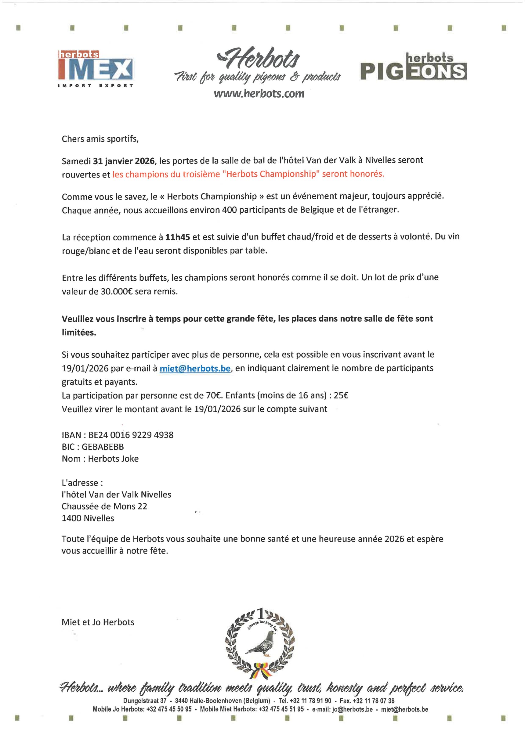 Comme vous le savez, le « Herbots Championship » est un événement majeur, toujours apprécié. Chaque année, nous accueillons environ 400 participants de Belgique et de l'étranger.