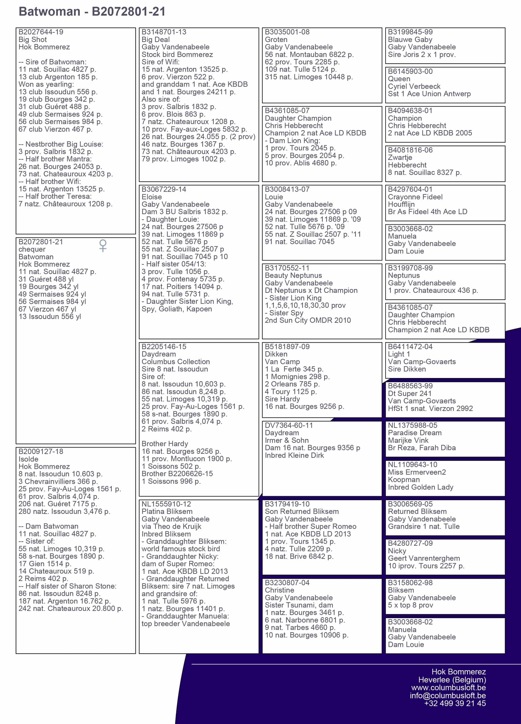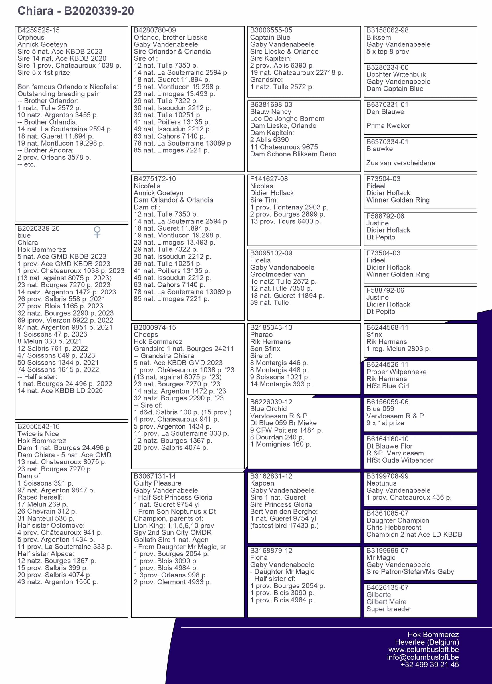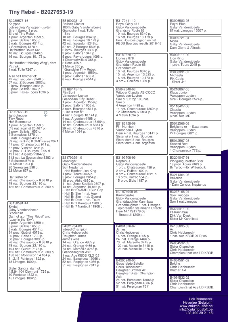 ½ sister “063” 14 Nat Ace long distance KBDB 2020 – 1 Trelou 1.037p – 8 Nat (z) Brive 747p – 11 Prov Limoges 2.365p – 12 Nat (z) Souillac 1.305p