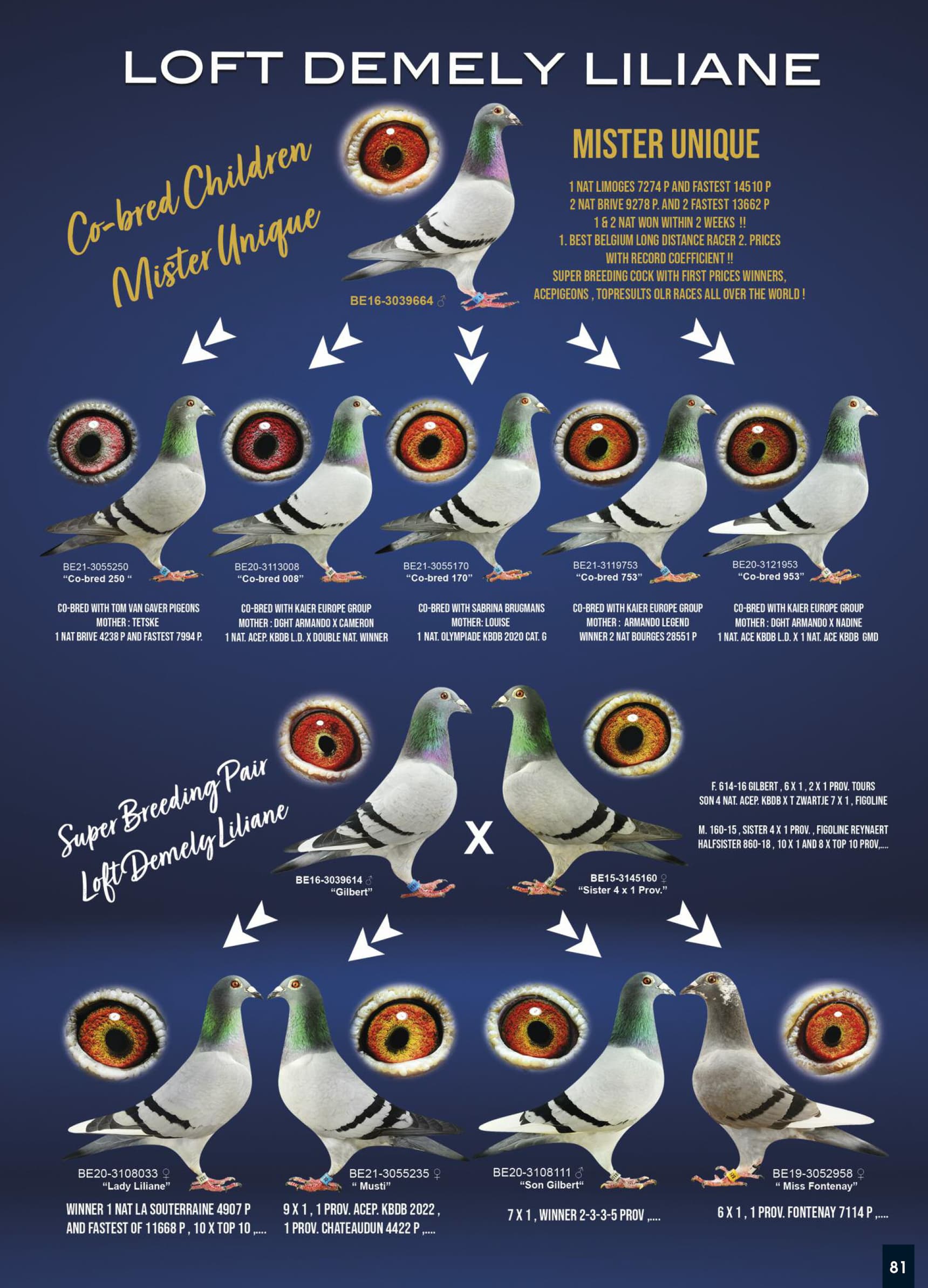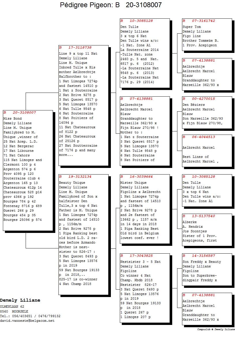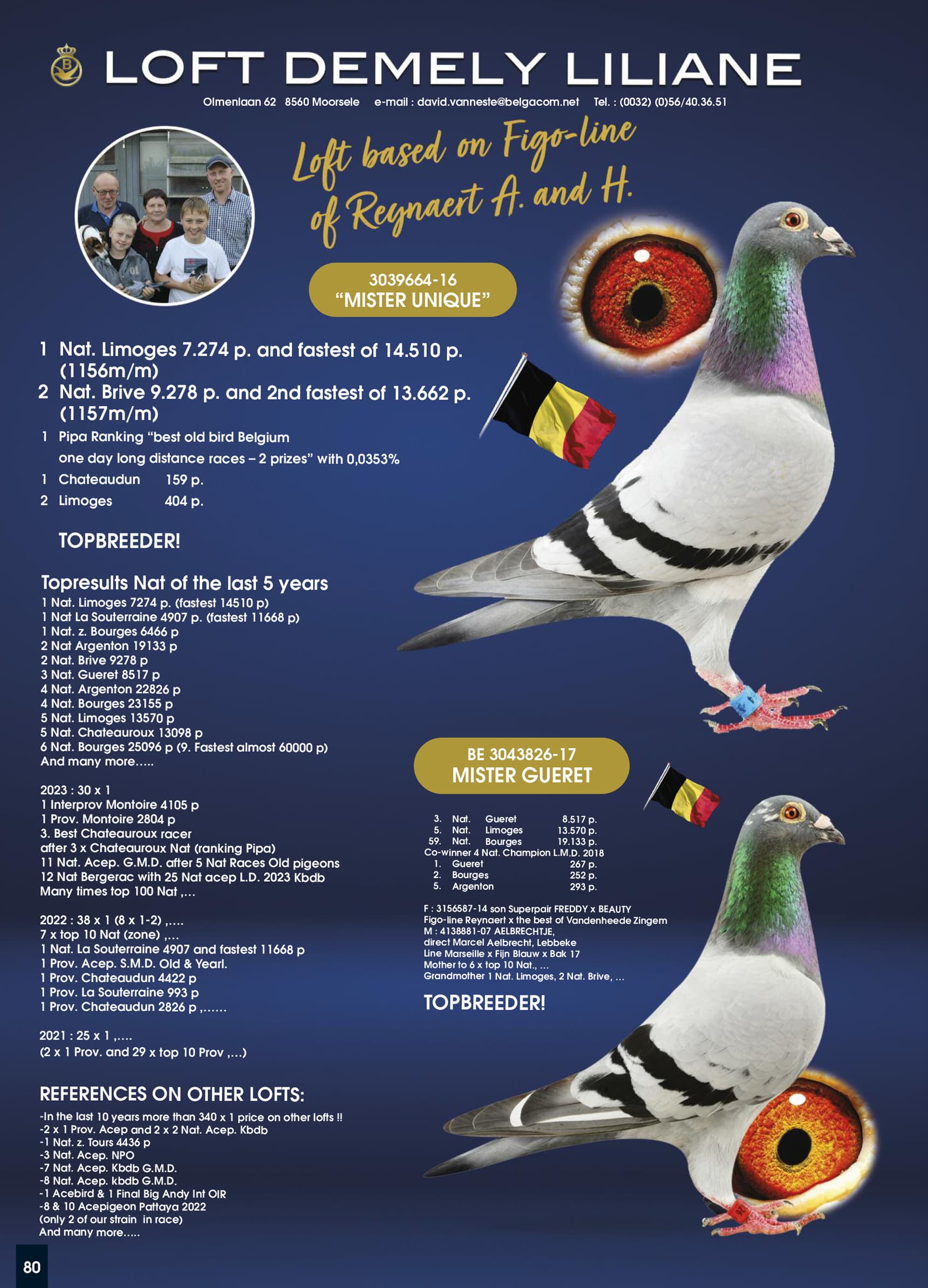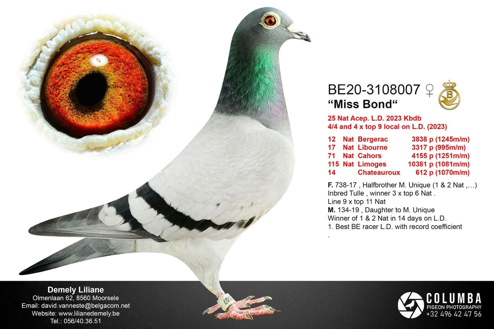 Mais les petits-enfants de "Mr Unique" aiment aussi voler dans le haut du classement. Un de ses petits-enfants est "Miss Bond" (B20-3108007). Elle est devenue 26ème as national KBDB Fond 2023 avec des résultats comme 12ème Nat. Bergerac, 17ème Nat. Libourne et 71ème Nat. Cahors, elle peut être fière. Il n'y a que 2 colombophiles en Belgique qui ont un enfant de "Mr Unique" et parmi eux se trouve Herbots Jo. Avec lui, les petits-enfants ont fait des performances fantastiques et ont gagné : 1er Prov. Vierzon 2.752d. - 3ème Lorris 584d. - 3e Soissons 283d. - 3ème Orléans 151d. - 8e Chateauroux 1.051d. - 3e Issoudun 911d. - 9e S-Nat Bourges 2,034d. - 10e S-Nat Chateauroux 783d. Remarquablement, la croix avec la ligne de "M. Gueret" (il faut dire tonton sur M. Unique) en particulier se porte très bien.